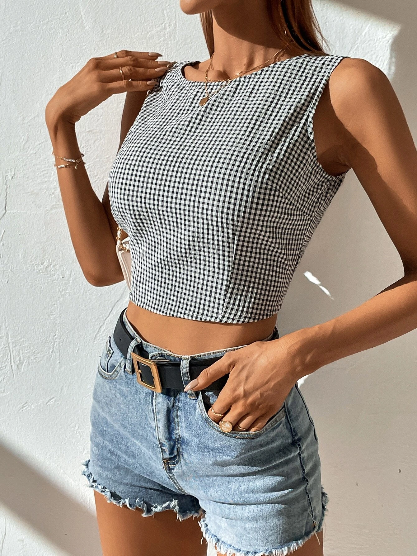 Blusa con estampado de guingán de espalda abierta con cordón