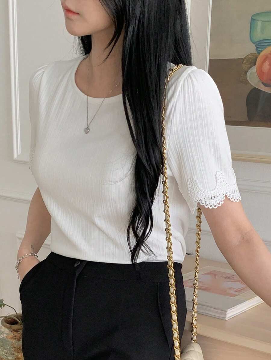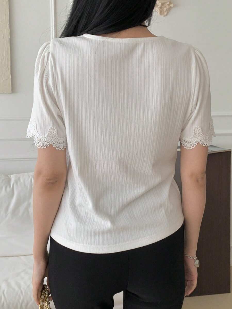 Blusa de cuello redondo con ajuste holgado y puños con ribete de encaje