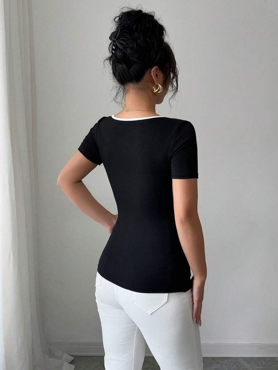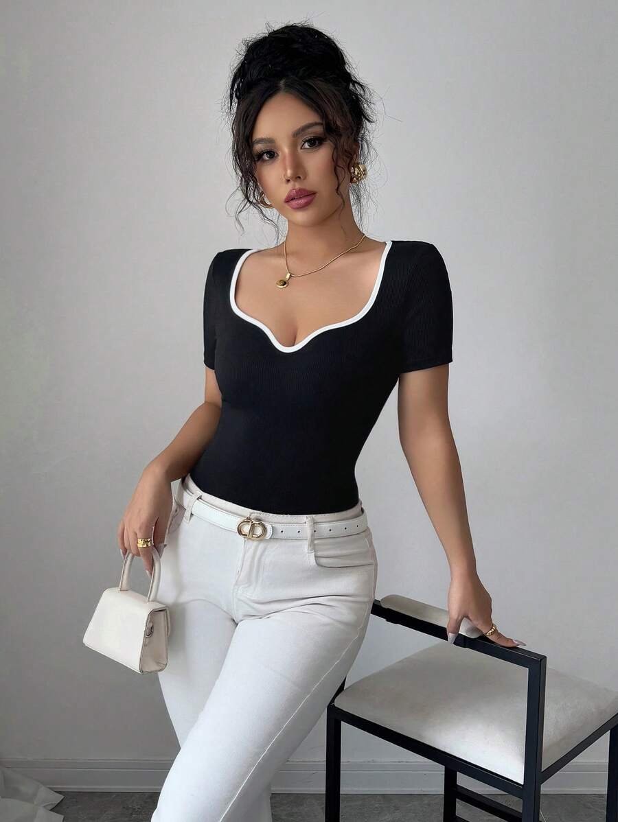 Blusa de manga corta con cuello corazón y ribete blanco en el cuello