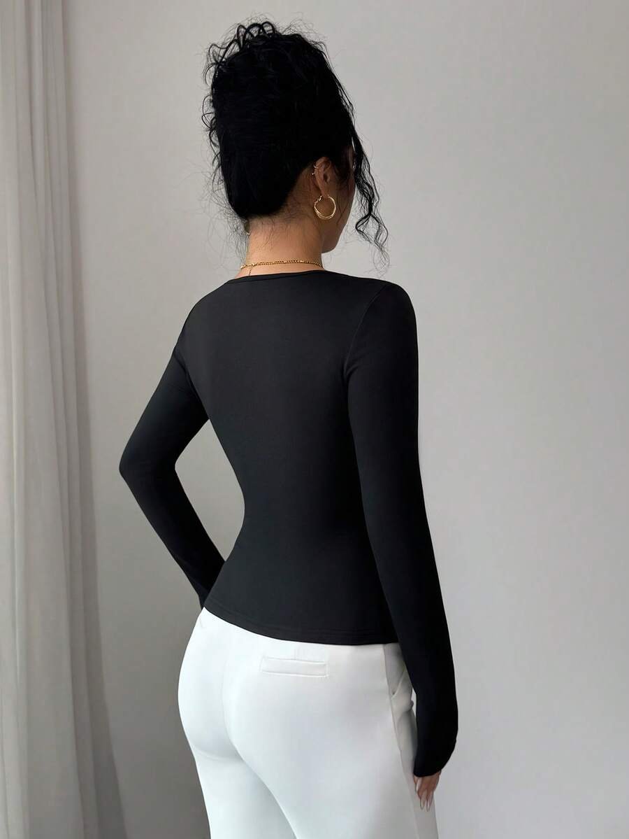 Blusa de manga larga con cuello asimétrico y bajo con abertura
