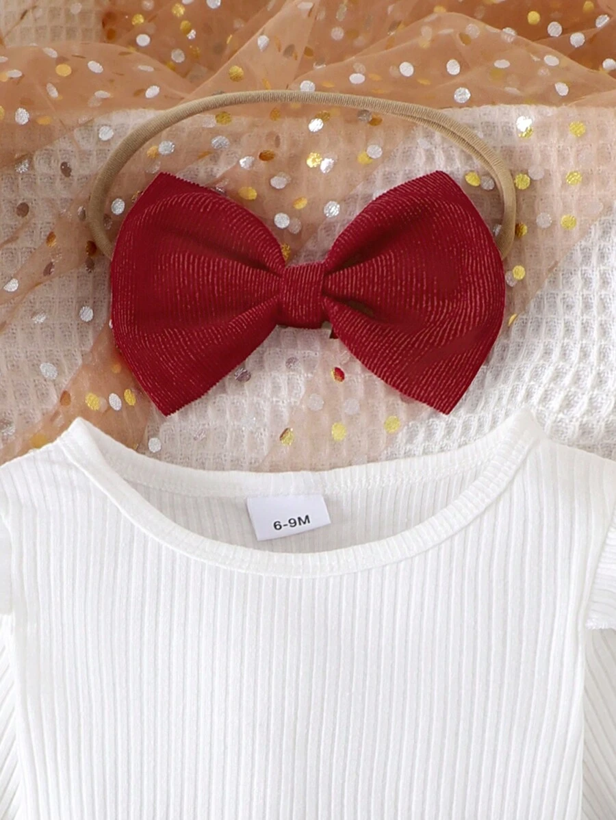 Blusa de manga larga de unicolor, falda con decoración de lazo y coletero