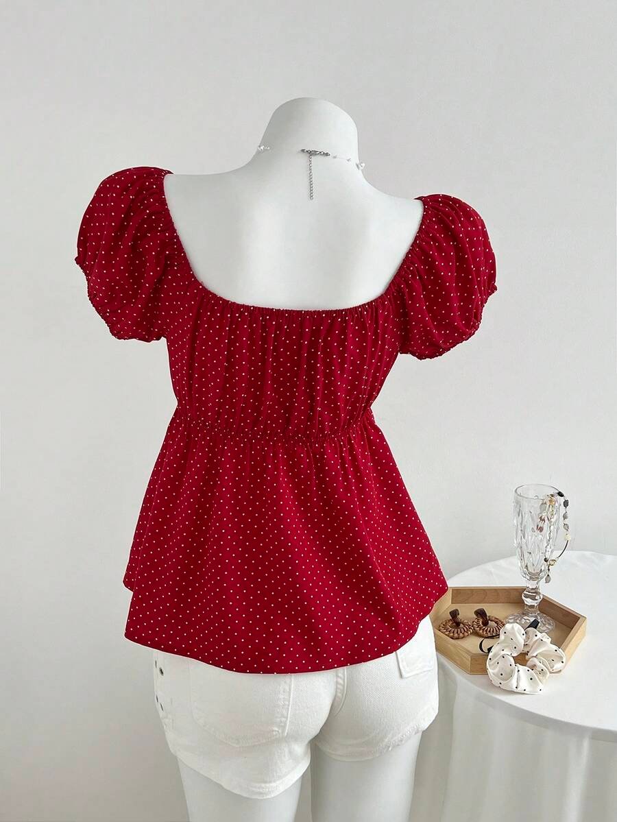 Blusa de cuello cuadrado con estampado de lunares y manga corta