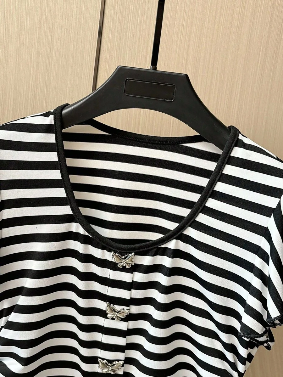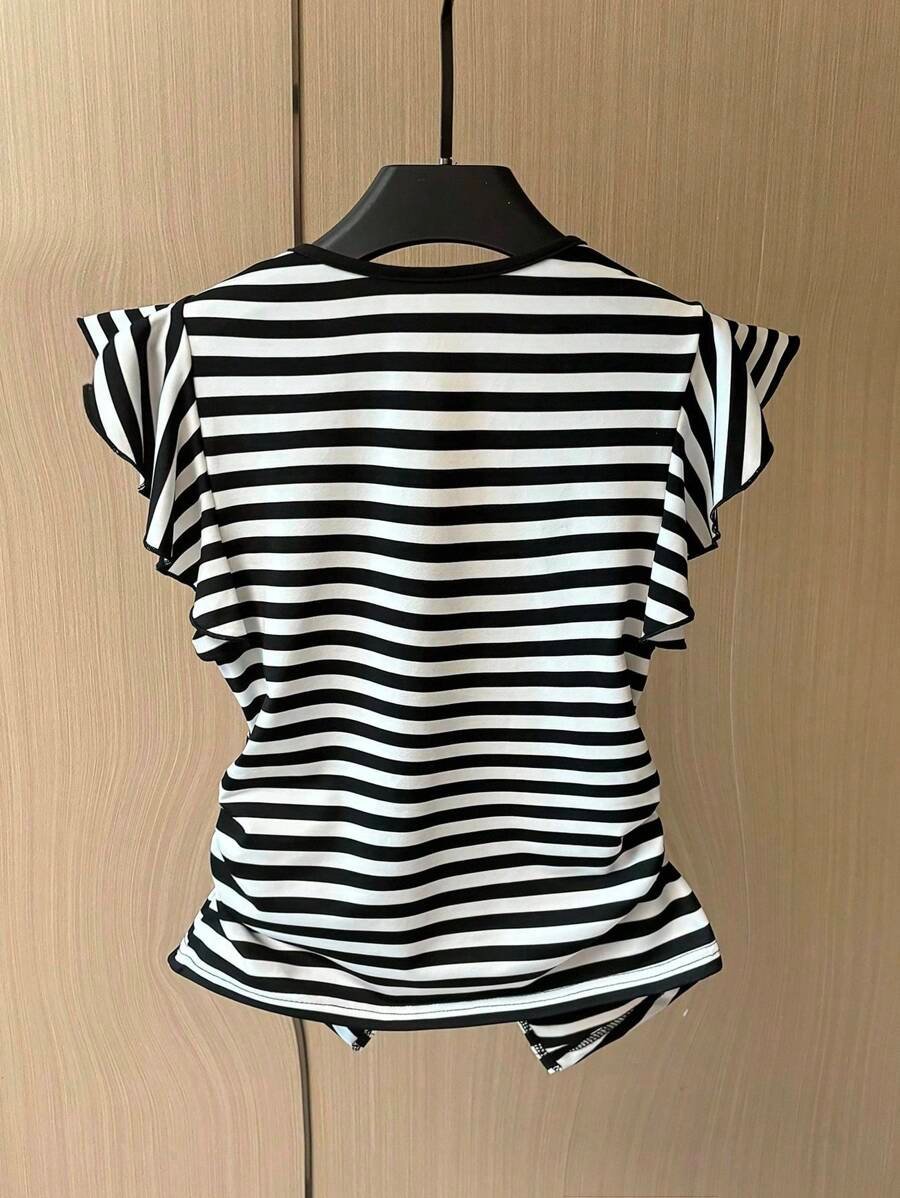 Blusa de punto con cuello en U, manga corta, bajo con efecto mariposa