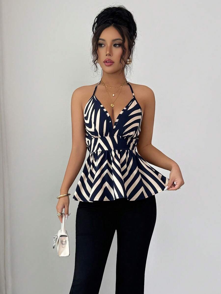 Blusa elegante de escote en V con tirantes de espagueti y pliegues delanteros