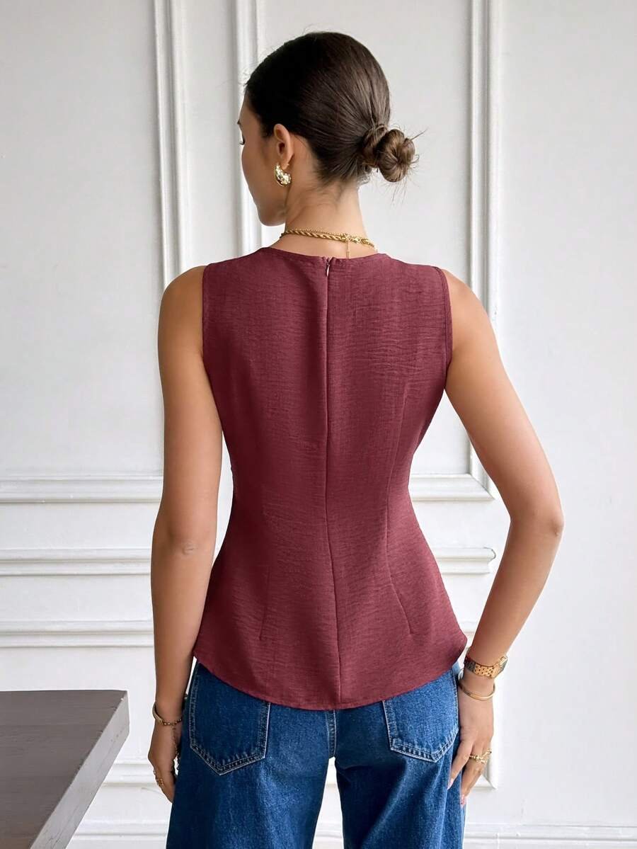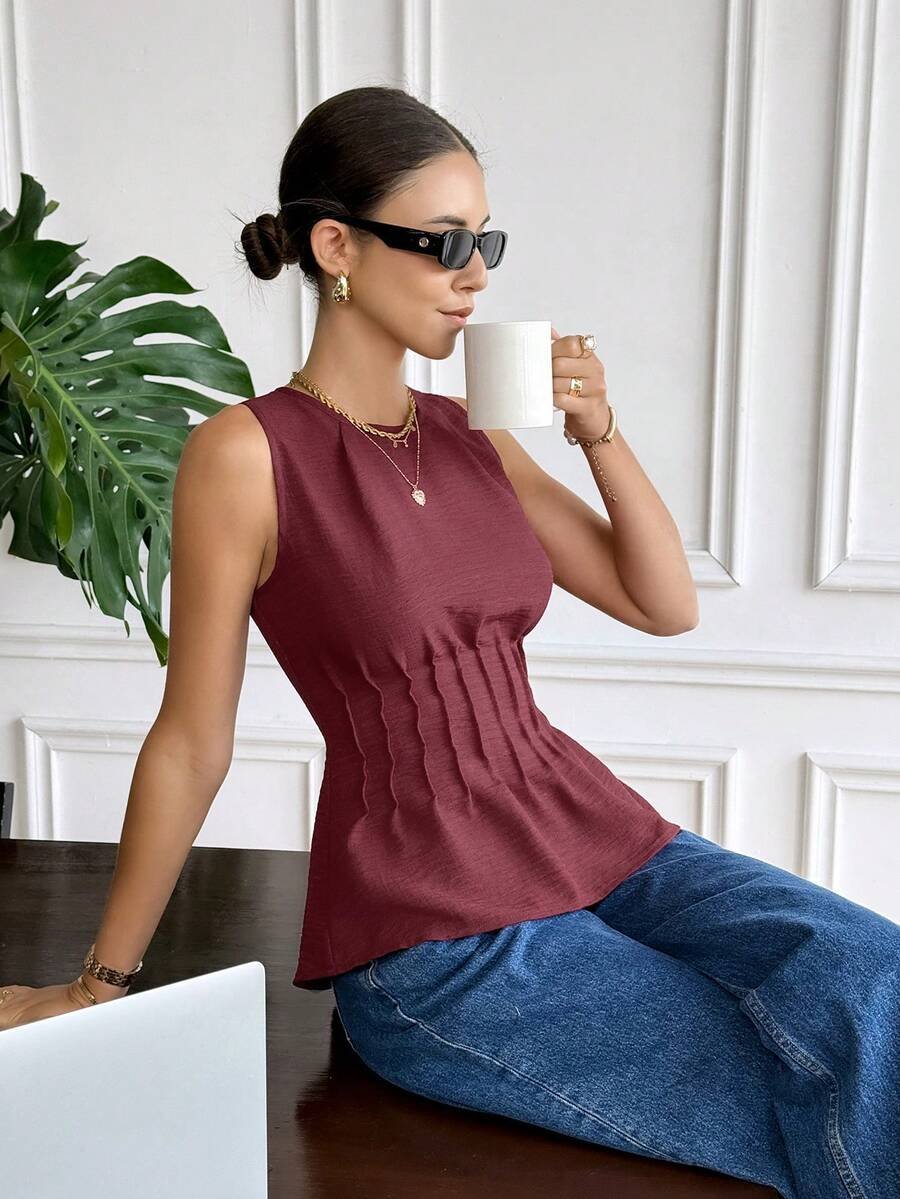 Blusa sin mangas de cuello redondo y cintura ceñida de unicolor