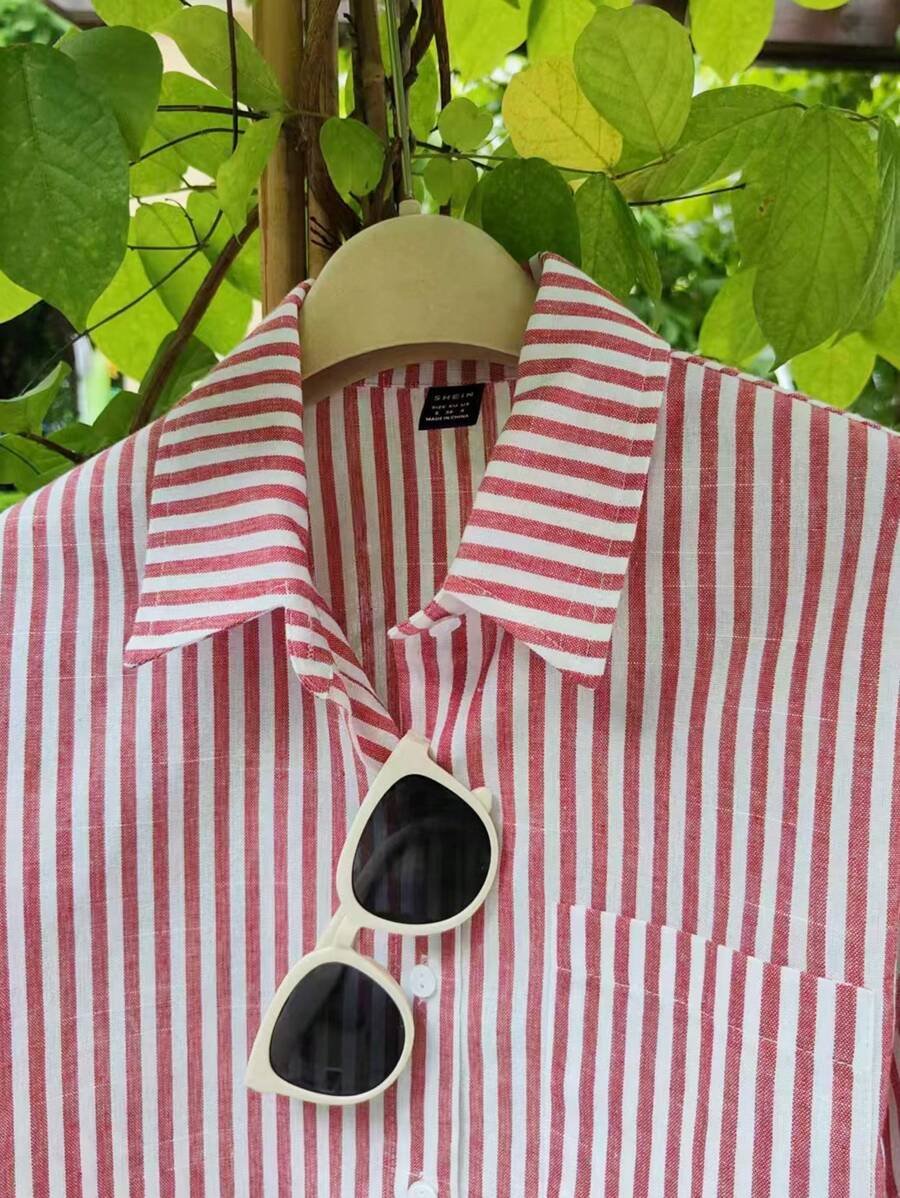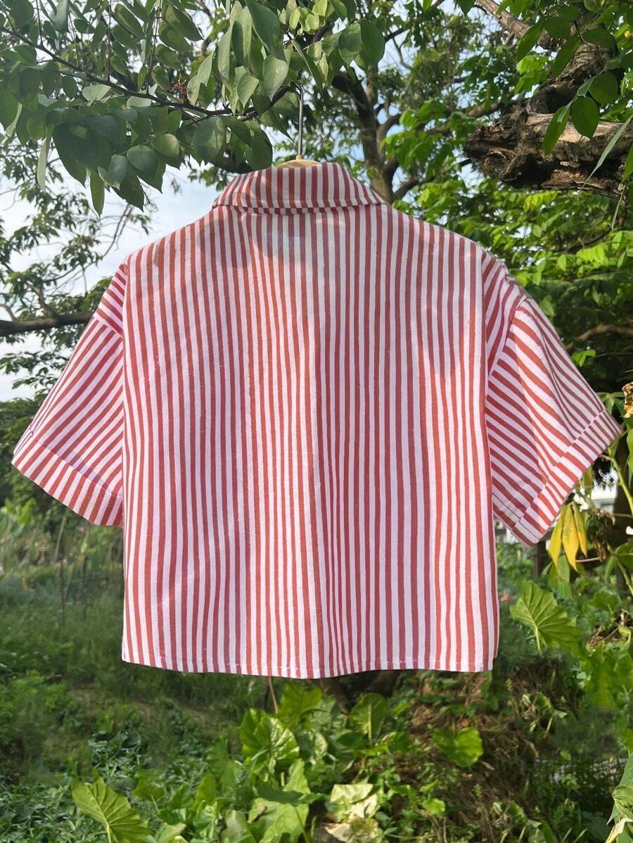 Camisa corta casual y holgada de mujer con rayas y mangas enrollables