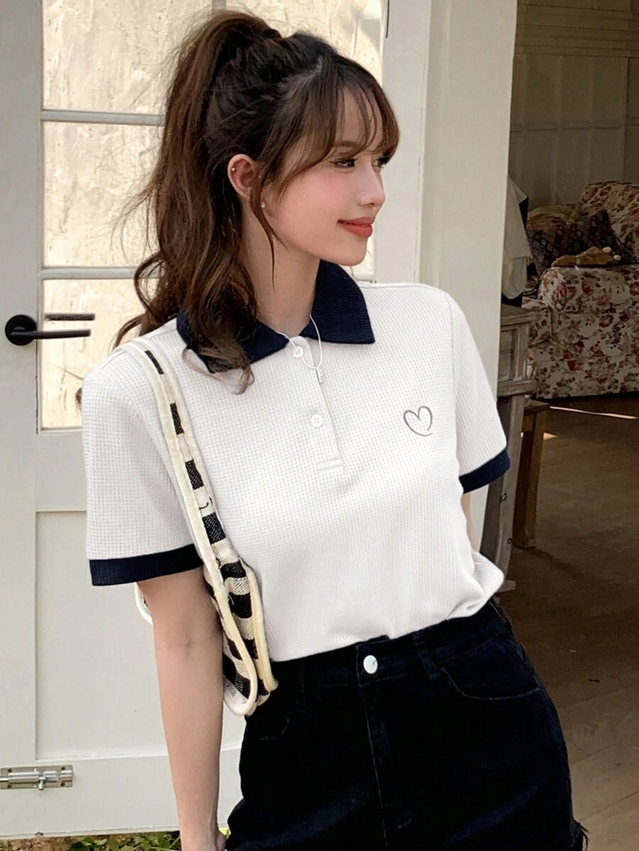 Camiseta con bordado de corazón de cuello en contraste
