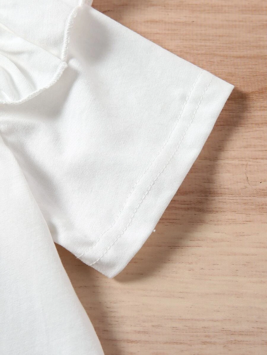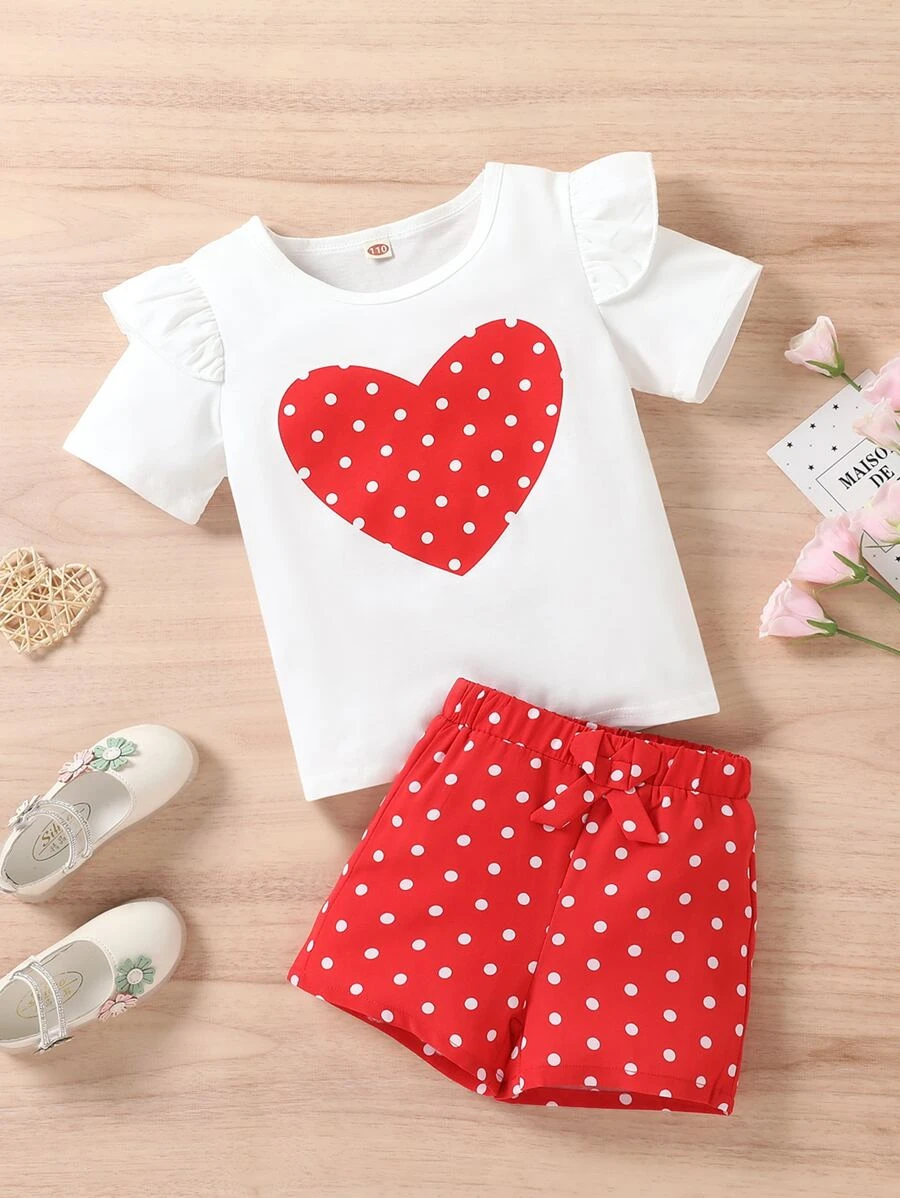 Camiseta con estampado de corazón ribete con fruncido & Shorts de lunares con lazo delantero
