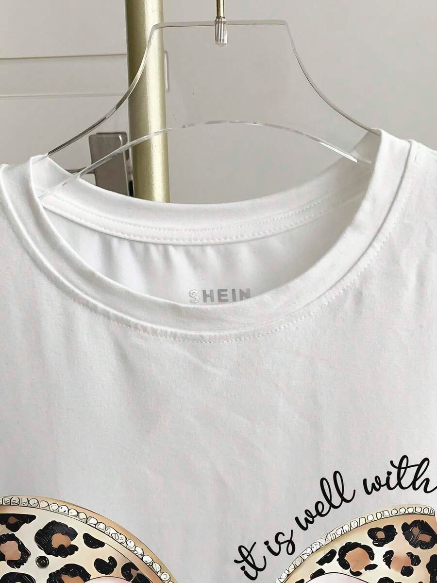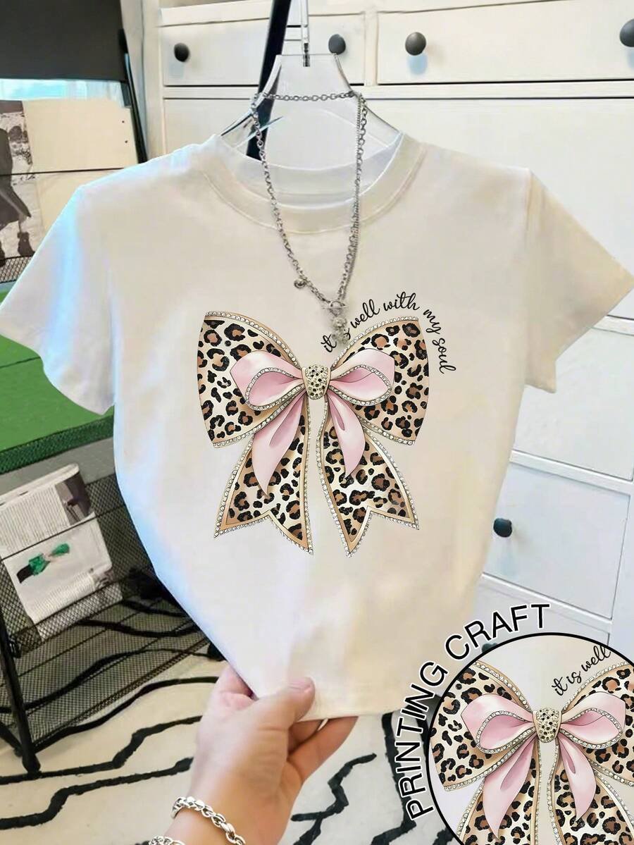 Camiseta de cuello redondo con lazo y estampado de leopardo