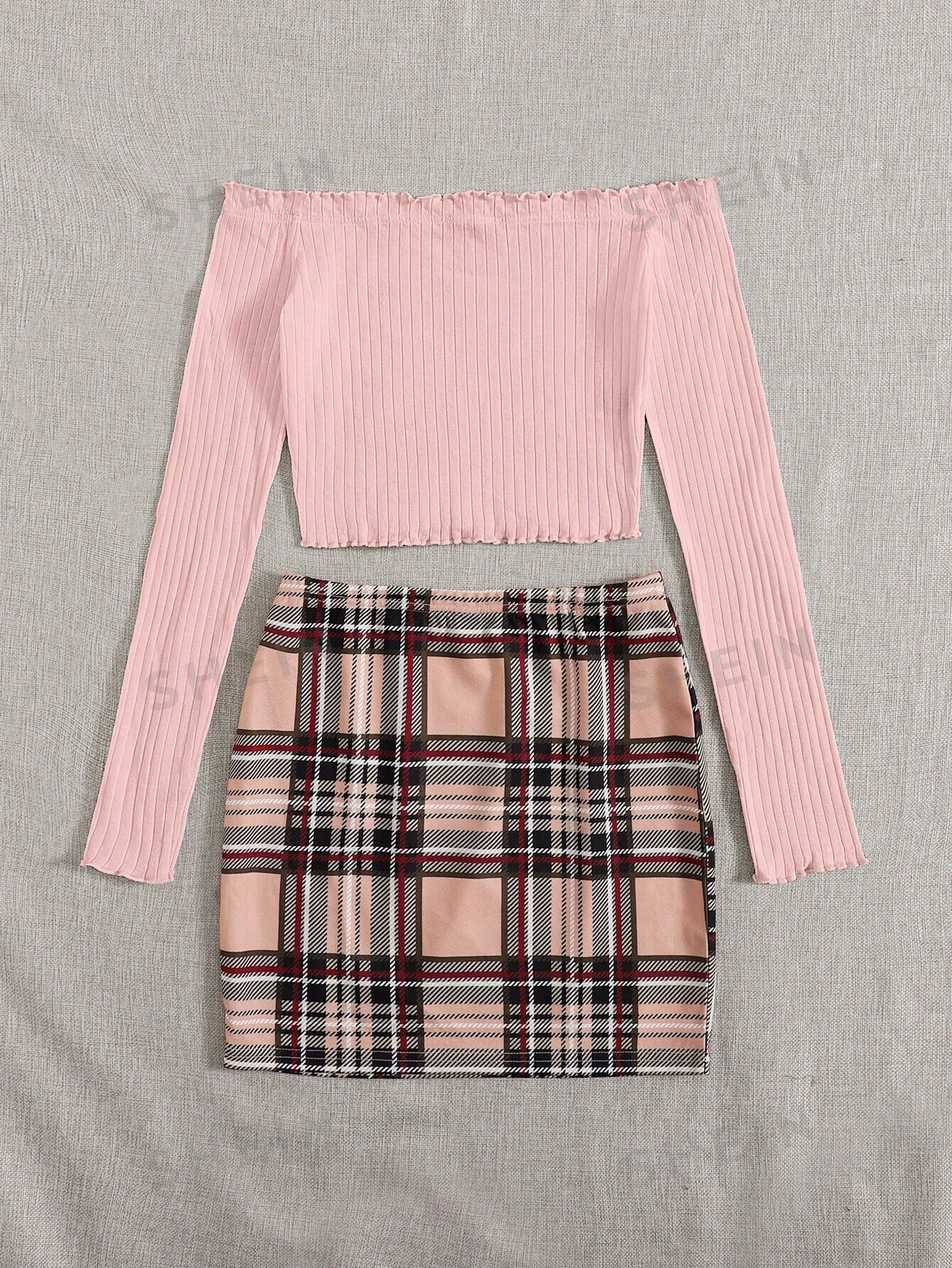 Camiseta de hombros descubiertos ribete en forma de lechuga & Falda de cuadros
