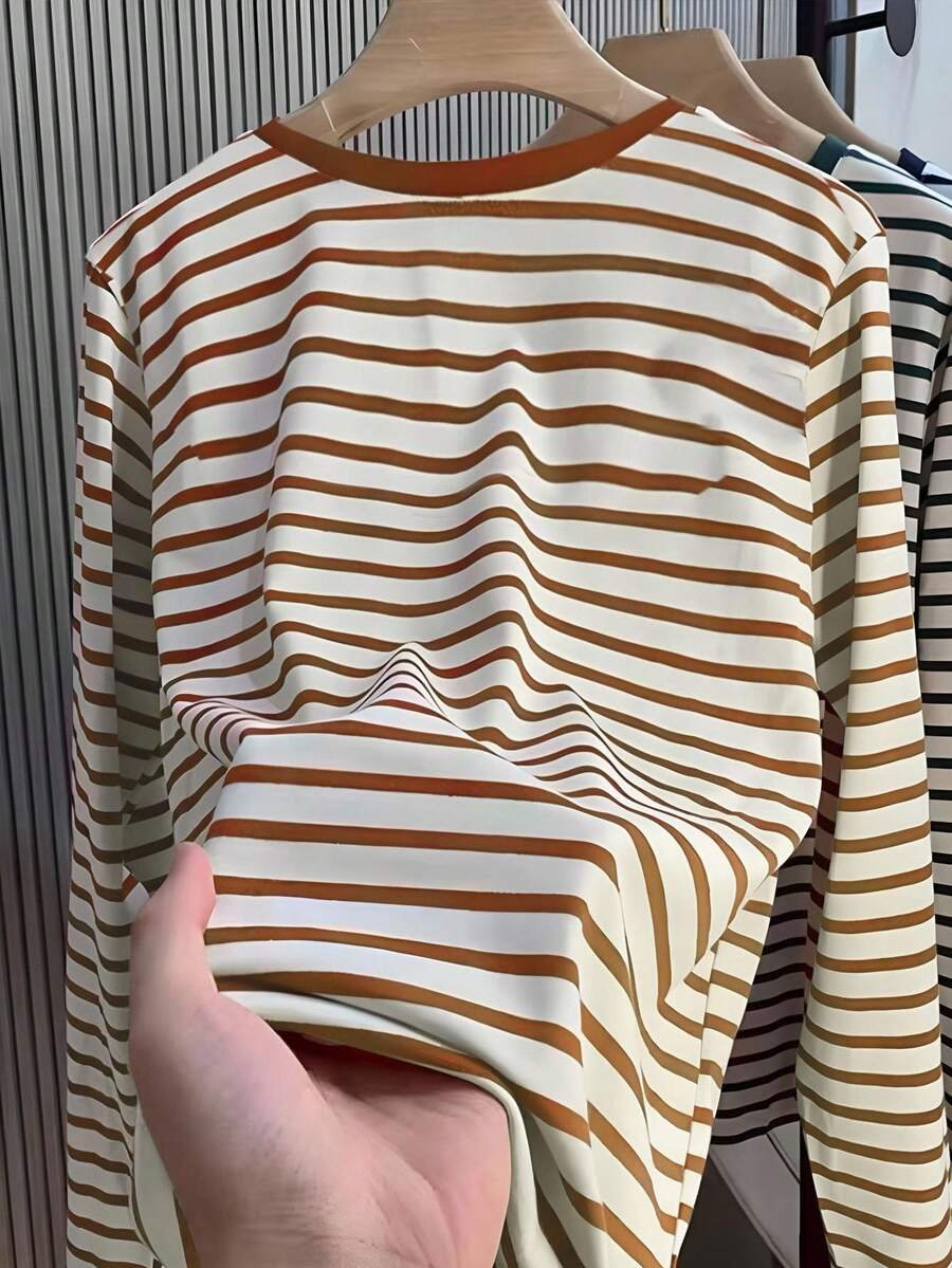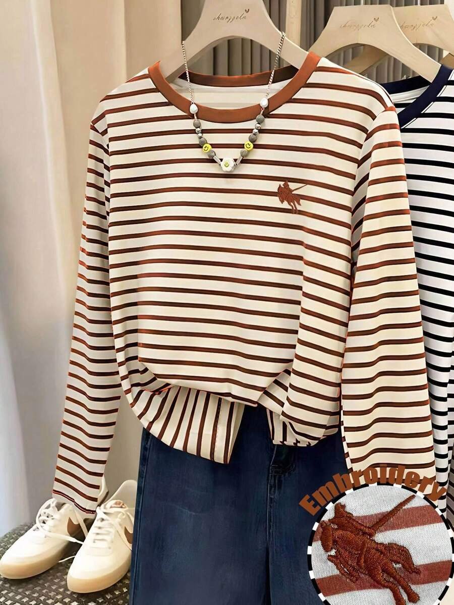 Camiseta de manga larga con cuello redondo, bordado de caballero y rayas