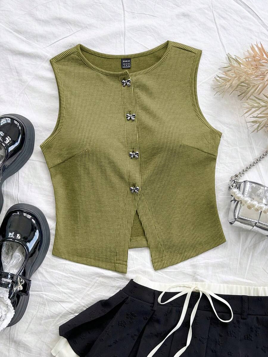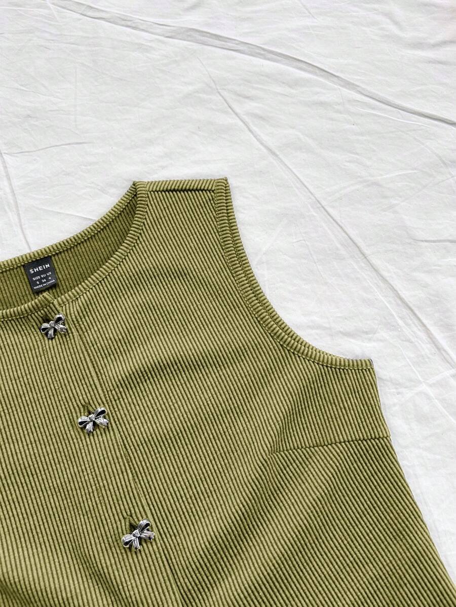 Camiseta de punto jacquard verde con decoración de botones de mariposa
