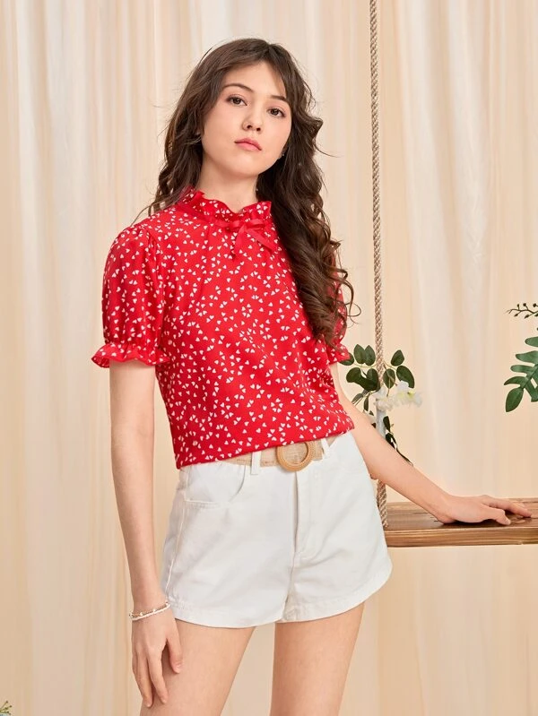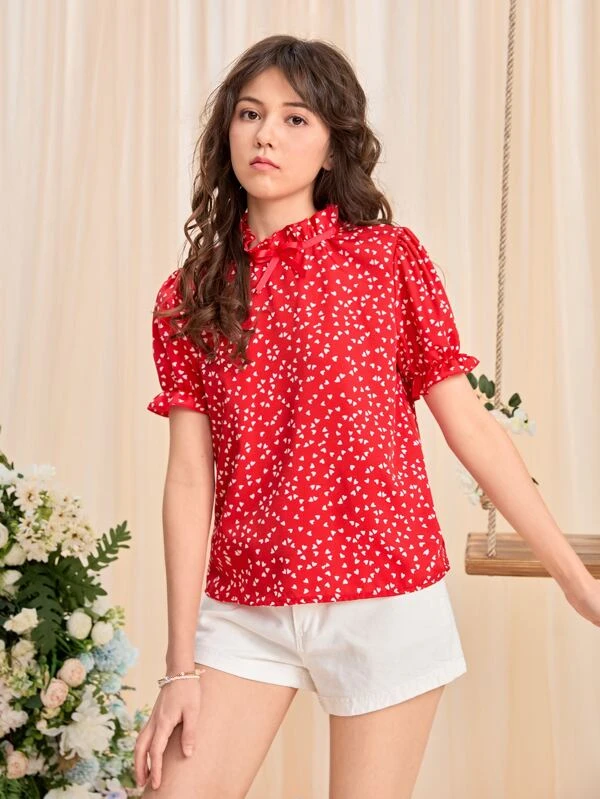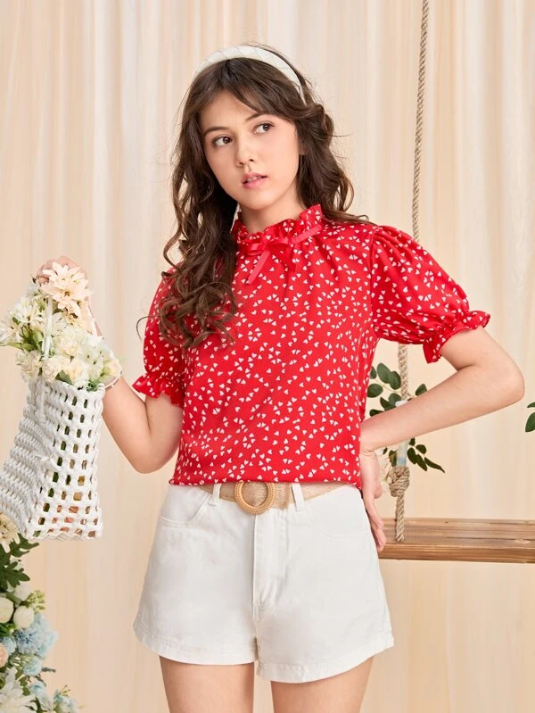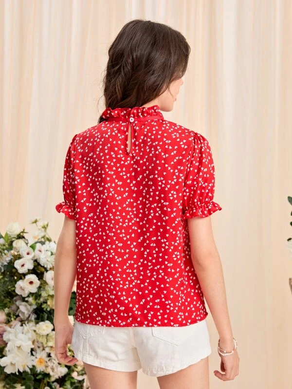 Chicas adolescentes Blusa con estampado de corazón de manga farol