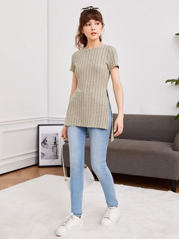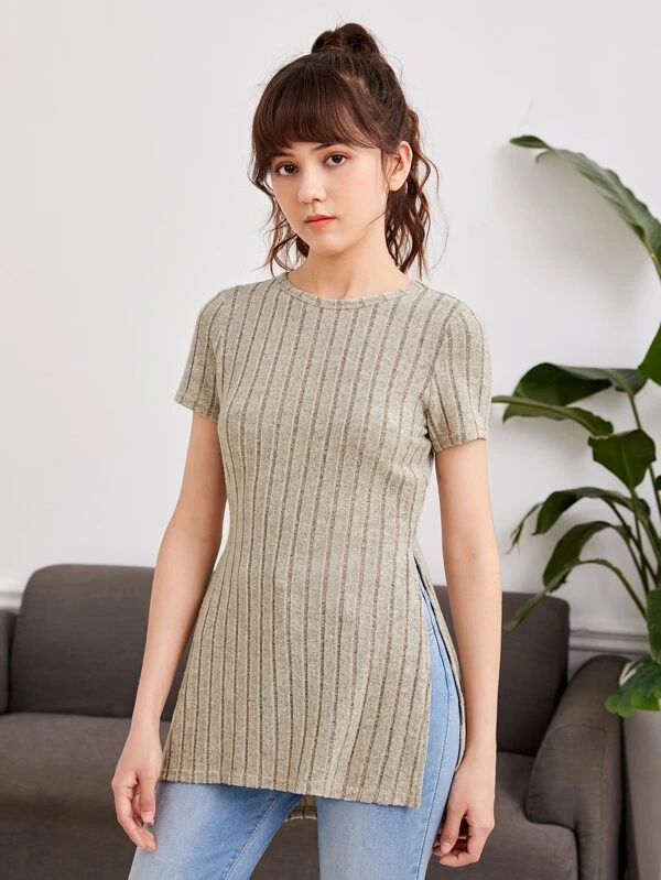 Chicas adolescentes Camiseta bajo con abertura tejido de canalé