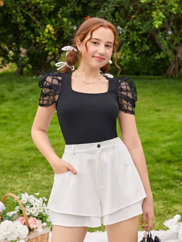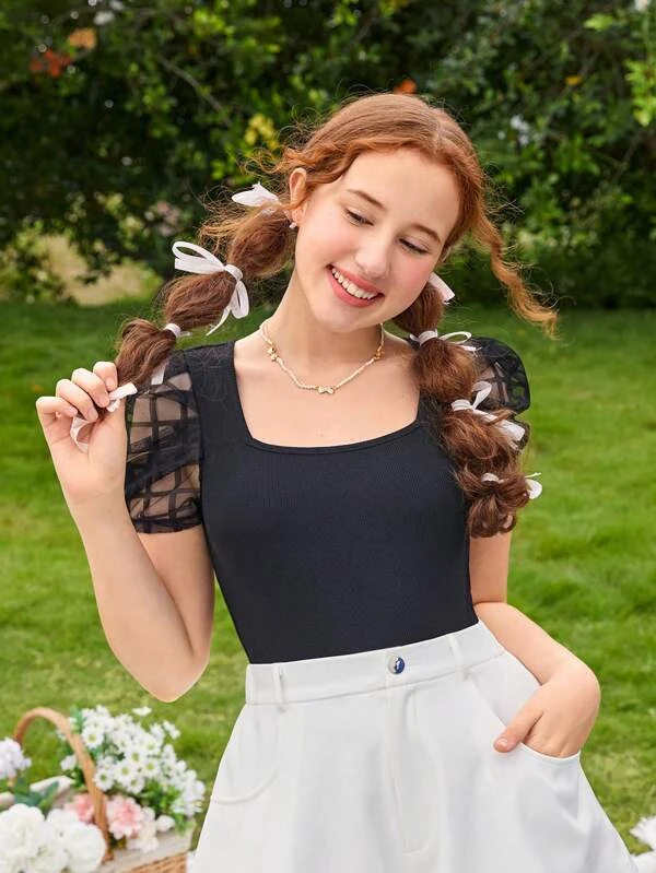 Chicas adolescentes Camiseta de cuadros de malla de manga farol
