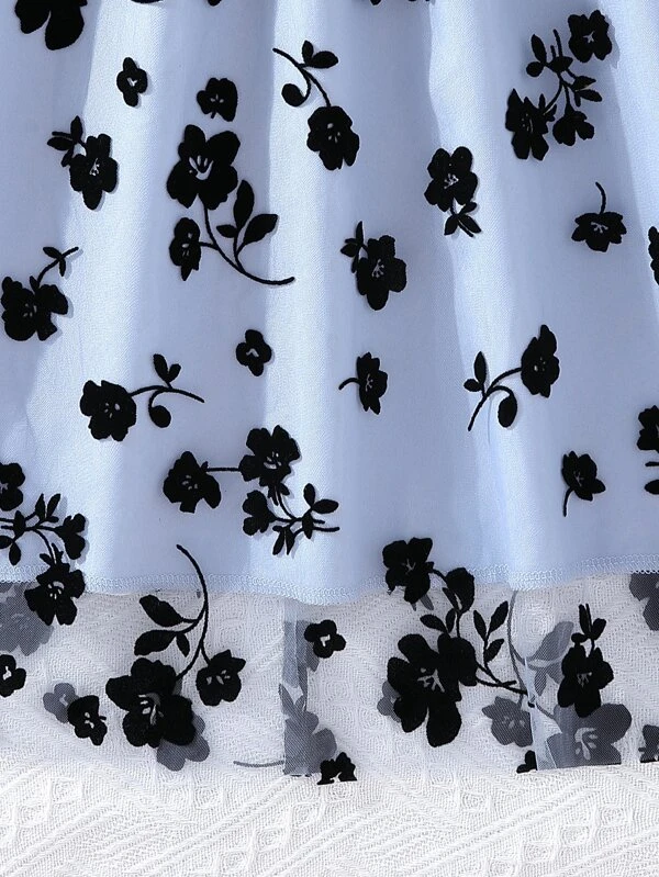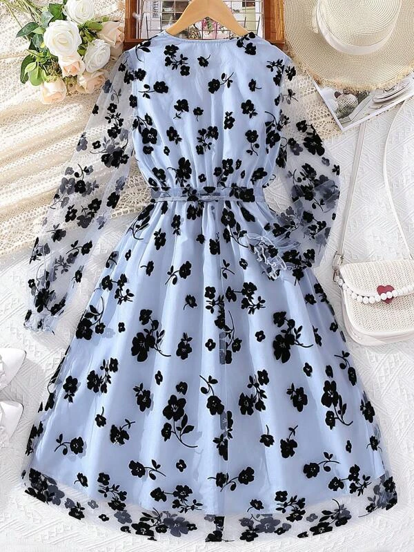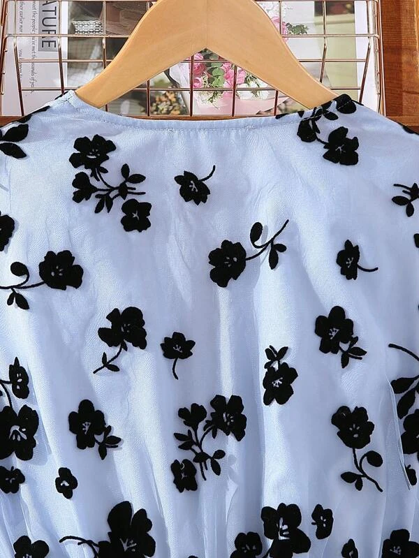 Chicas adolescentes Vestido con estampado floral de manga con volante de malla escote cruzado