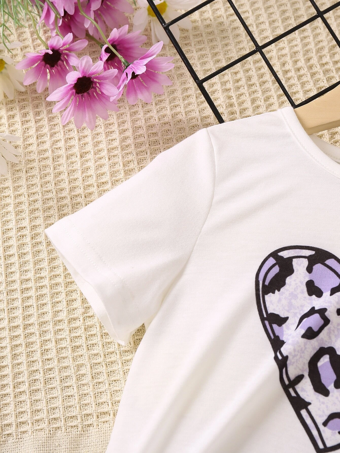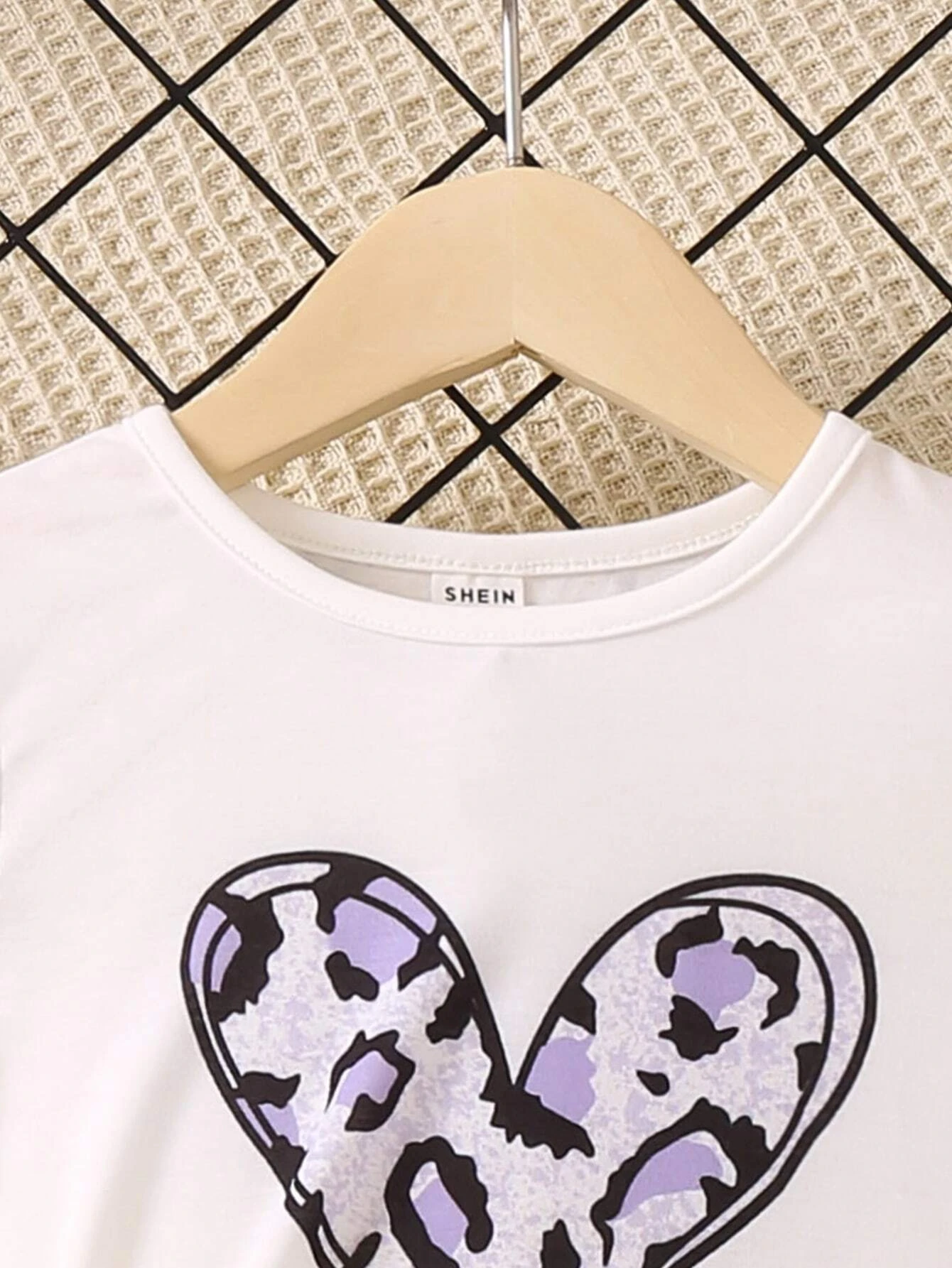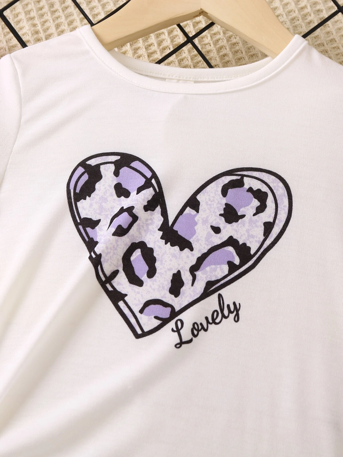 Conjunto cómodo de dos piezas con cuello redondo y mangas regulares simples y lindos con estampado de leopardo y corazón para niña joven, verano
