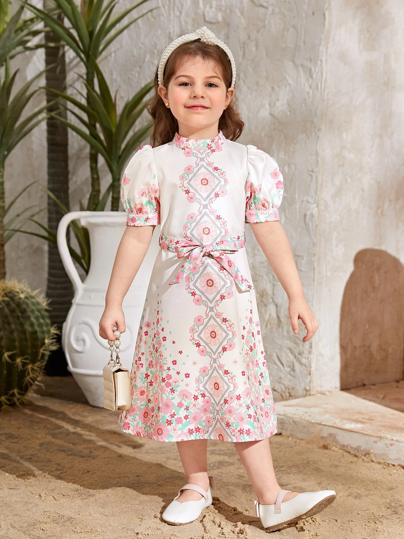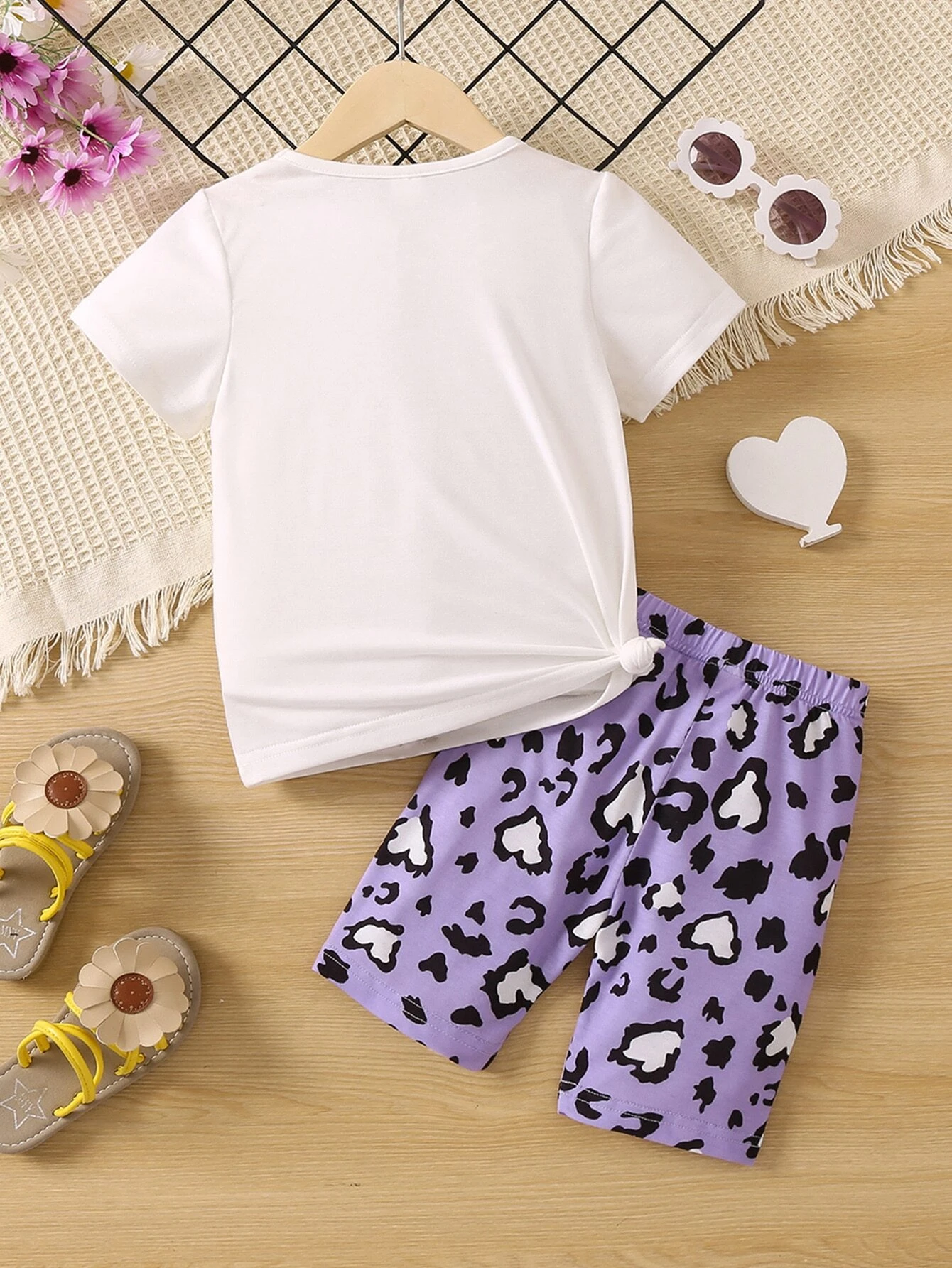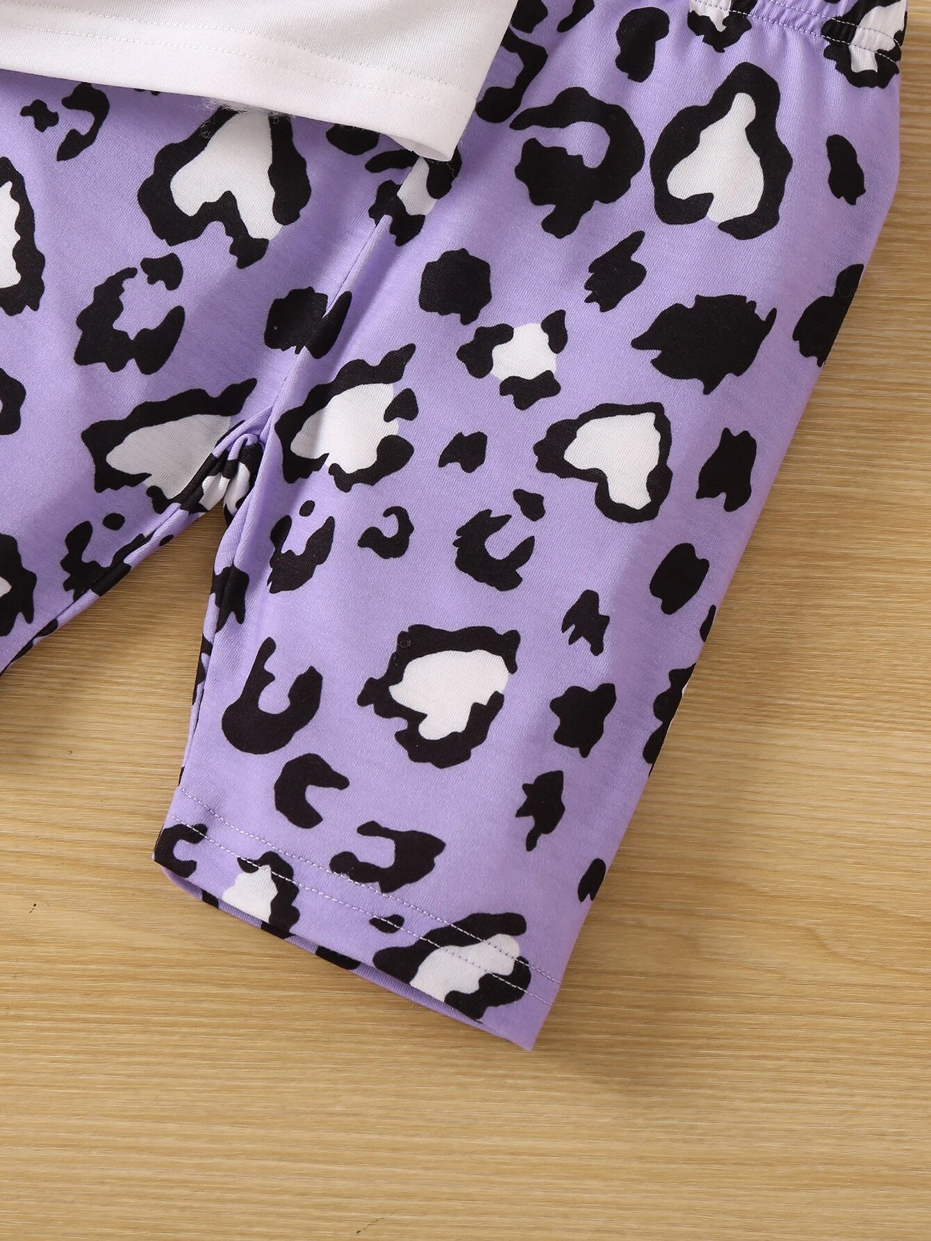 Conjunto cómodo de dos piezas con cuello redondo y mangas regulares simples y lindos con estampado de leopardo y corazón para niña joven, verano