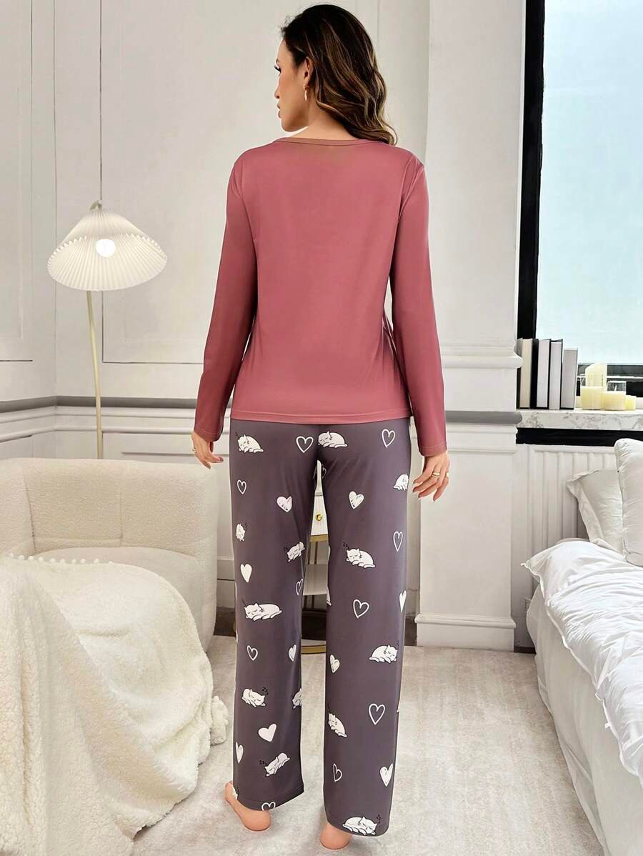 Conjunto de ropa de dormir informal con estampado de gato durmiendo