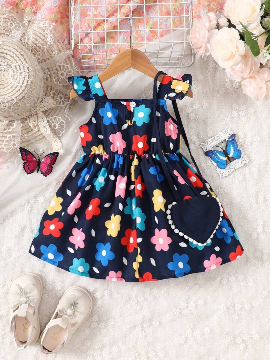 Conjunto de vestido de manga corta con estampado de flores lindo y bolso