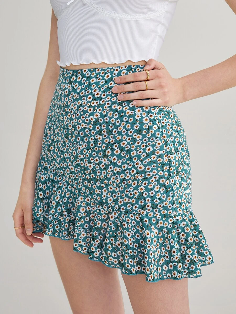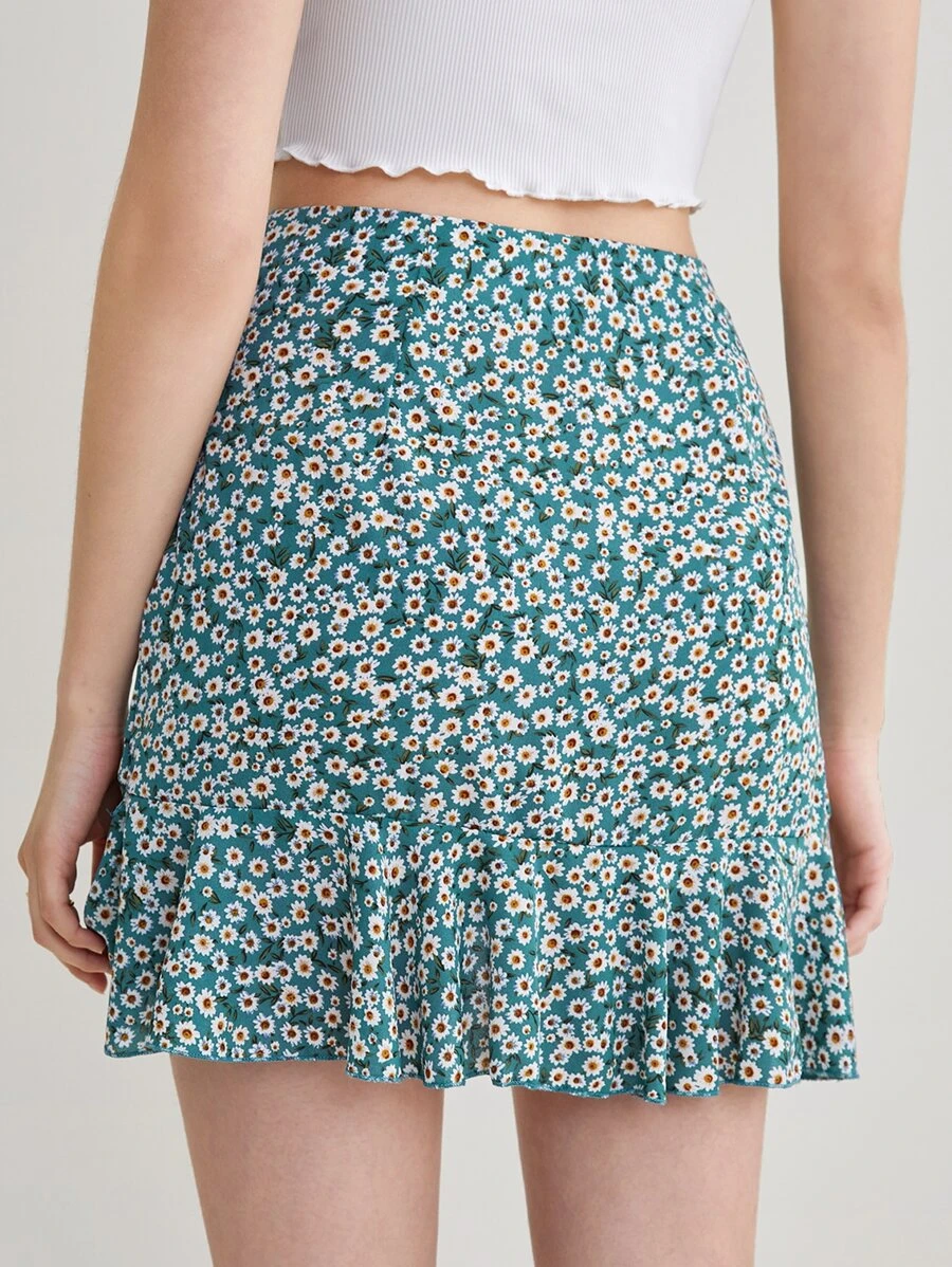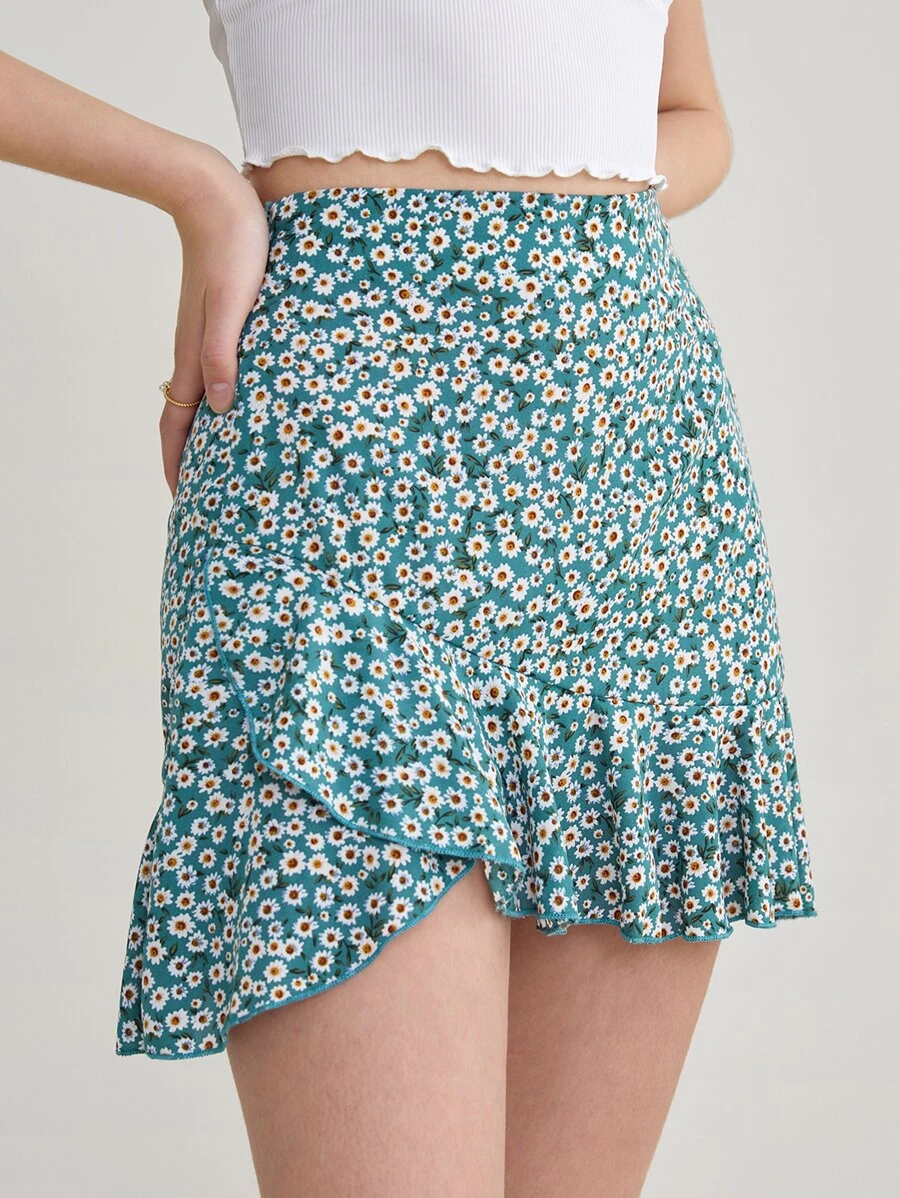 Falda floral asimétrico bajo con fruncido