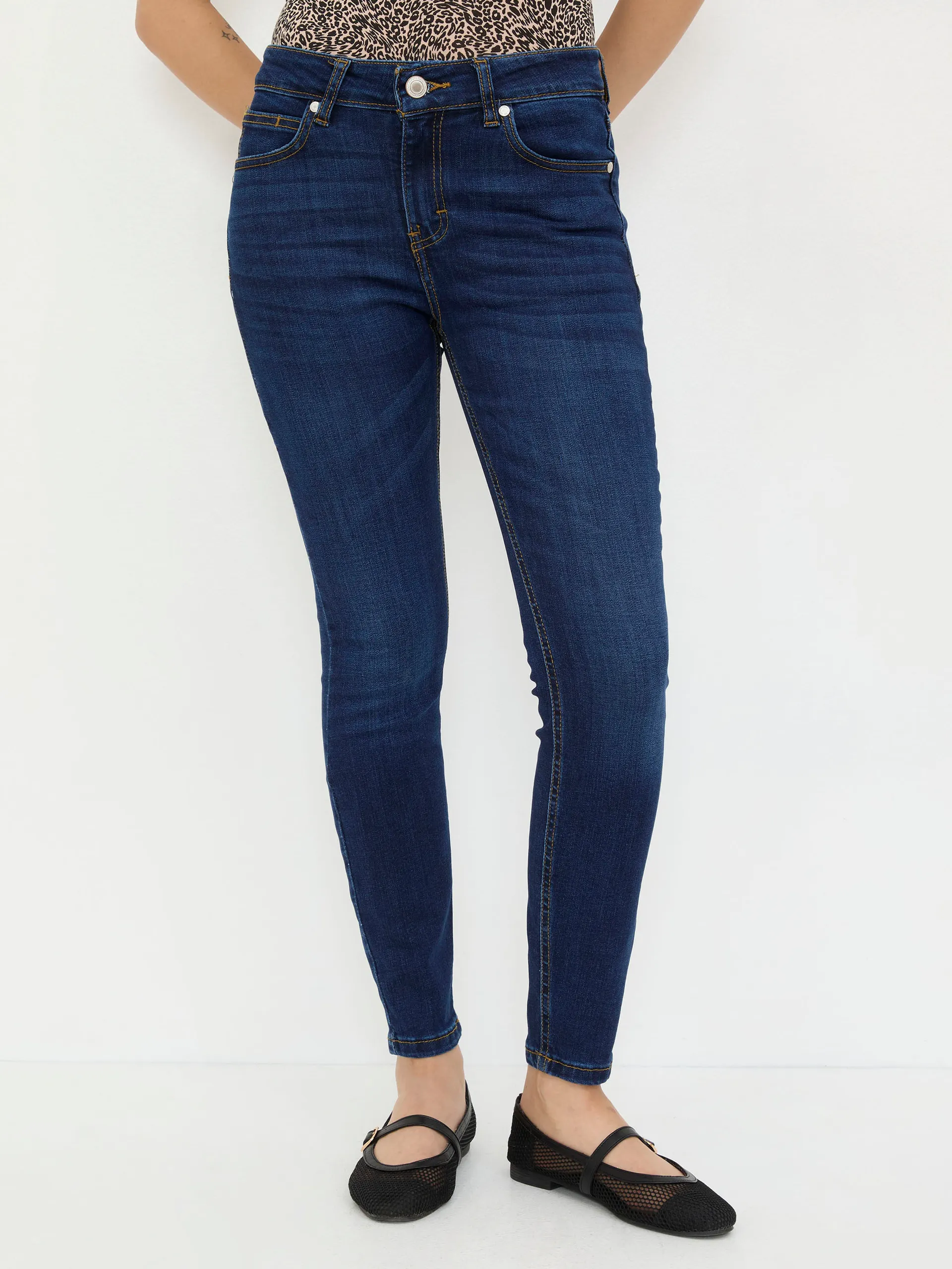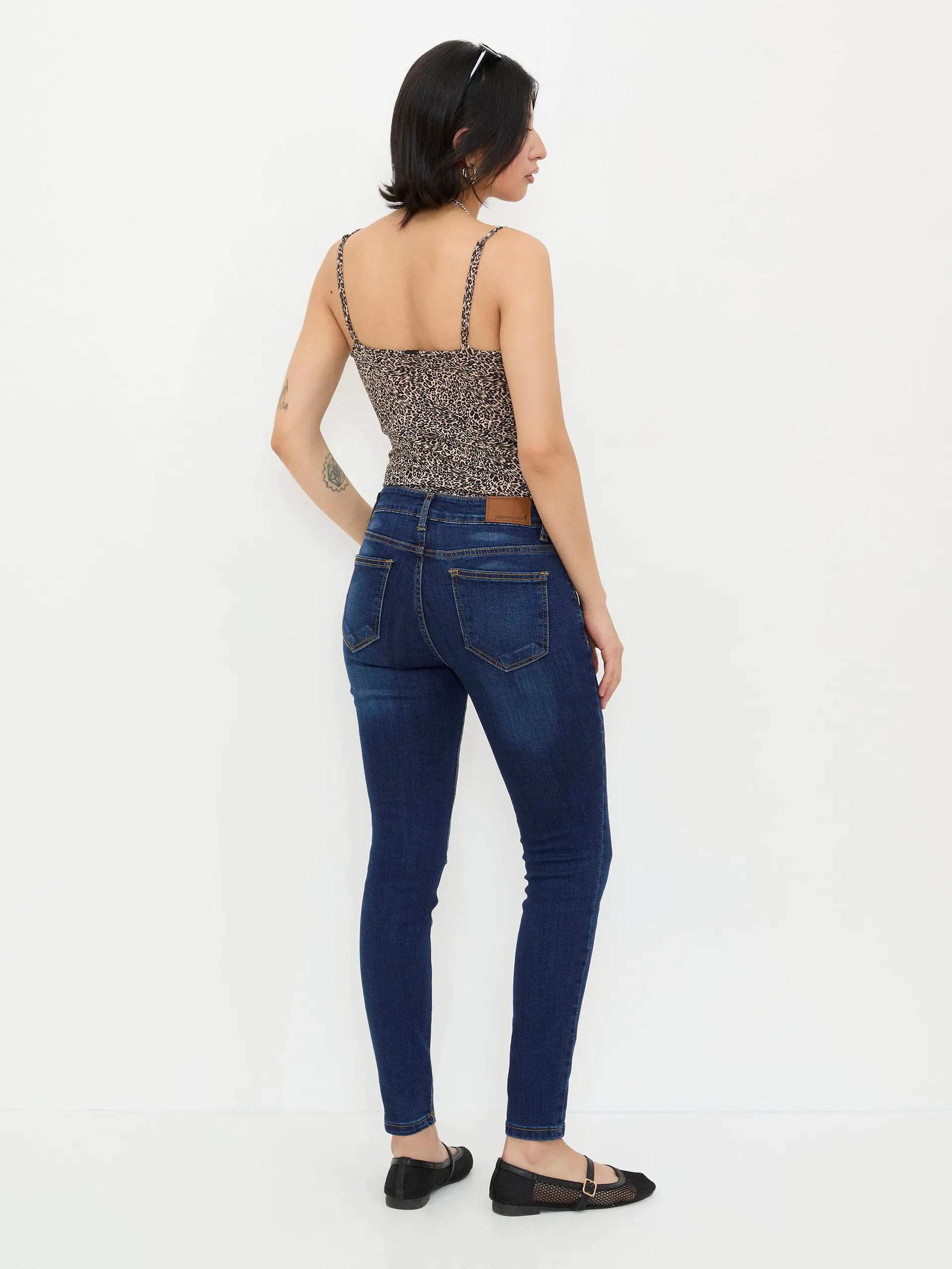 Jeans de mezclilla skinny azul oscuro, con cierre cremallera y botón.