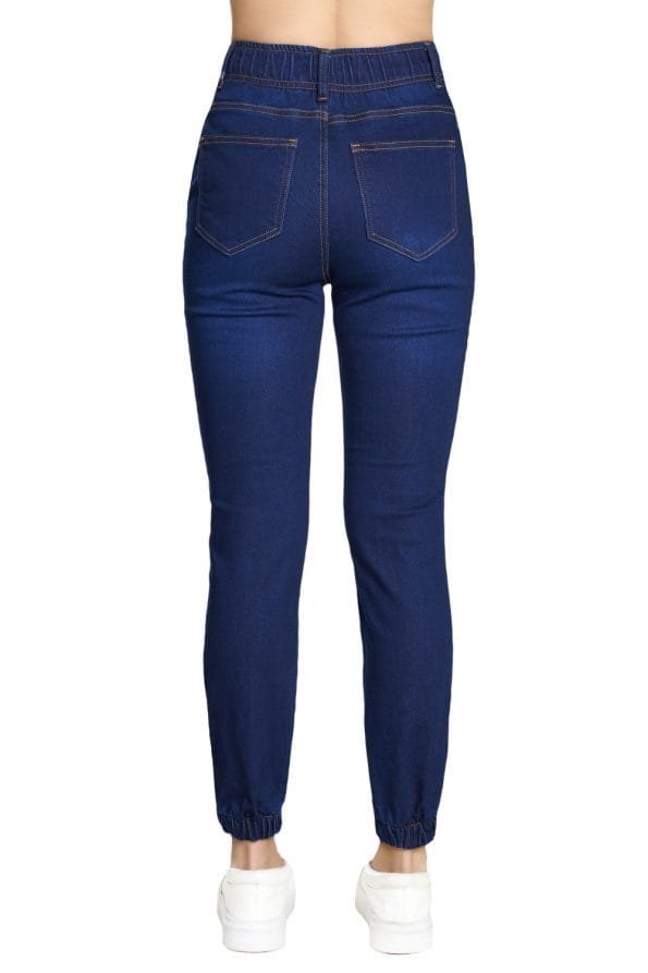 Jeans tipo jogger con tiro medio y pretina ancha de elástico detalle de bolsas laterales y elástico en tobillo diseño deslavado