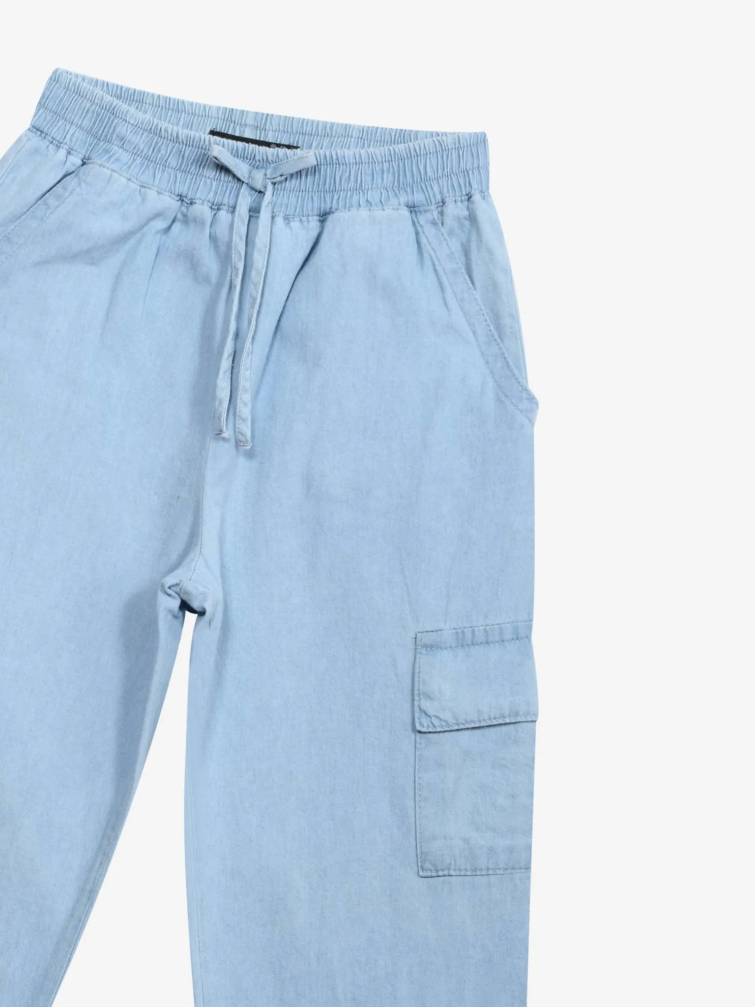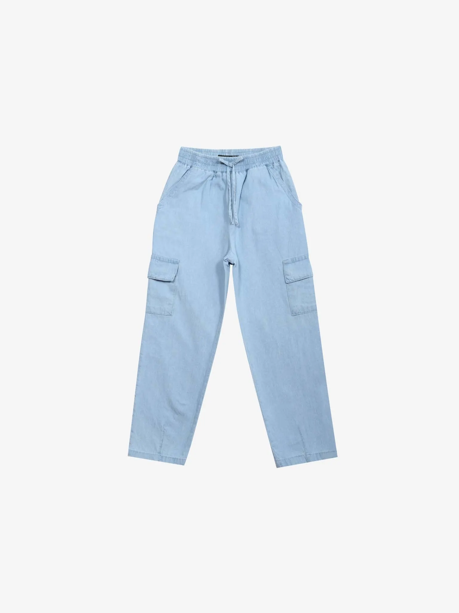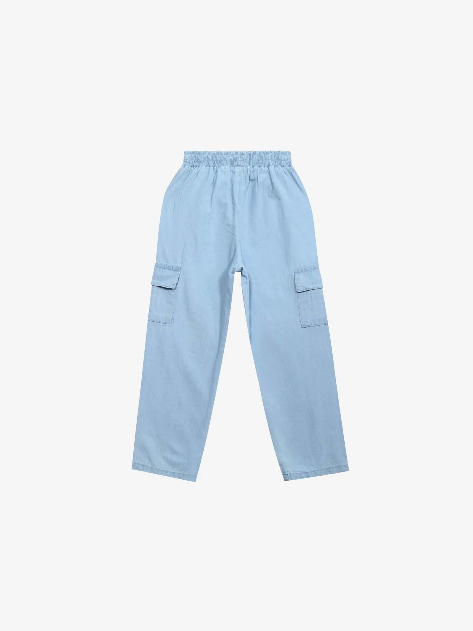 Jogger infantil y juvenil 4 a 14 años, chambray con jareta en cintura y un par de bolsillos cargo.