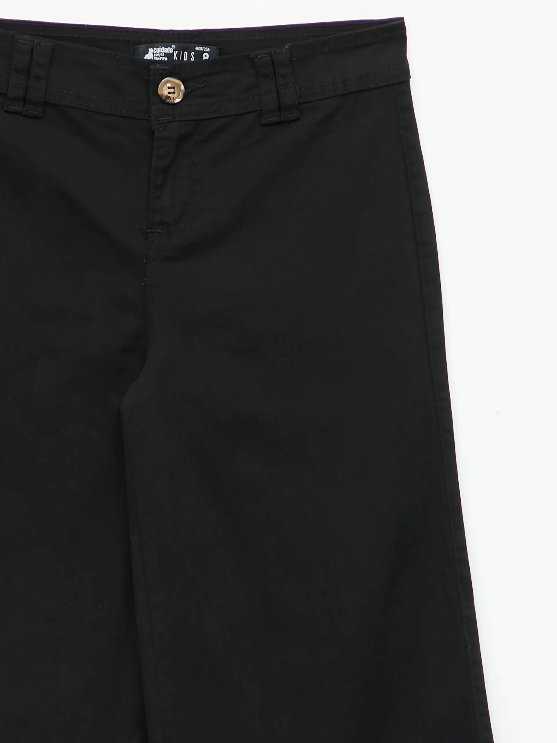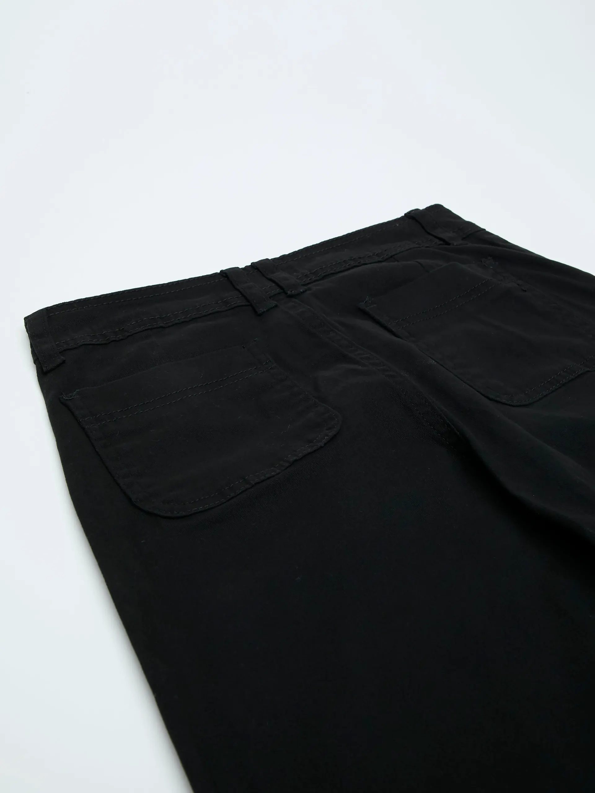 Pantalón negro amplio de gabardina con botón y bolsillos frontales.