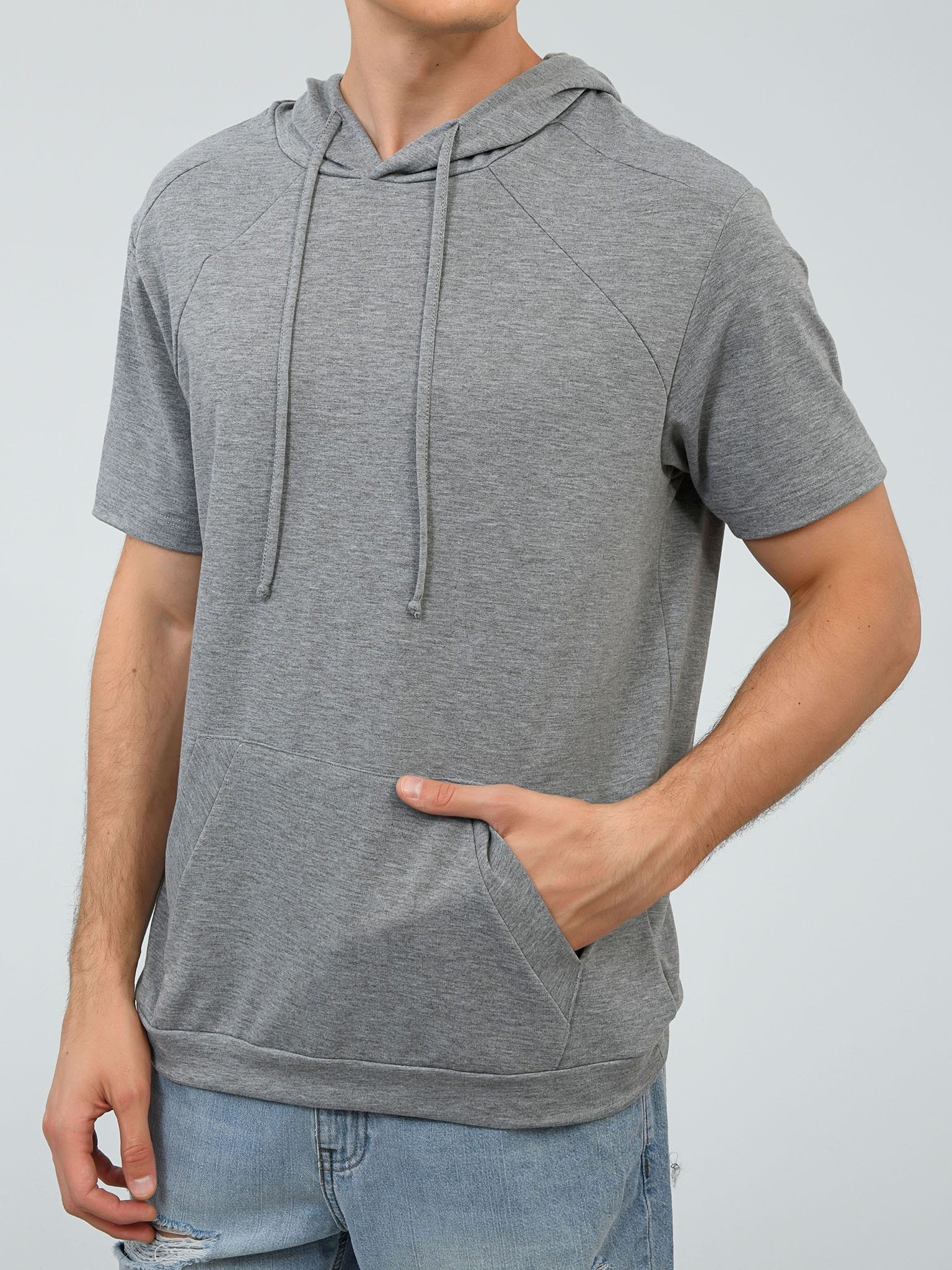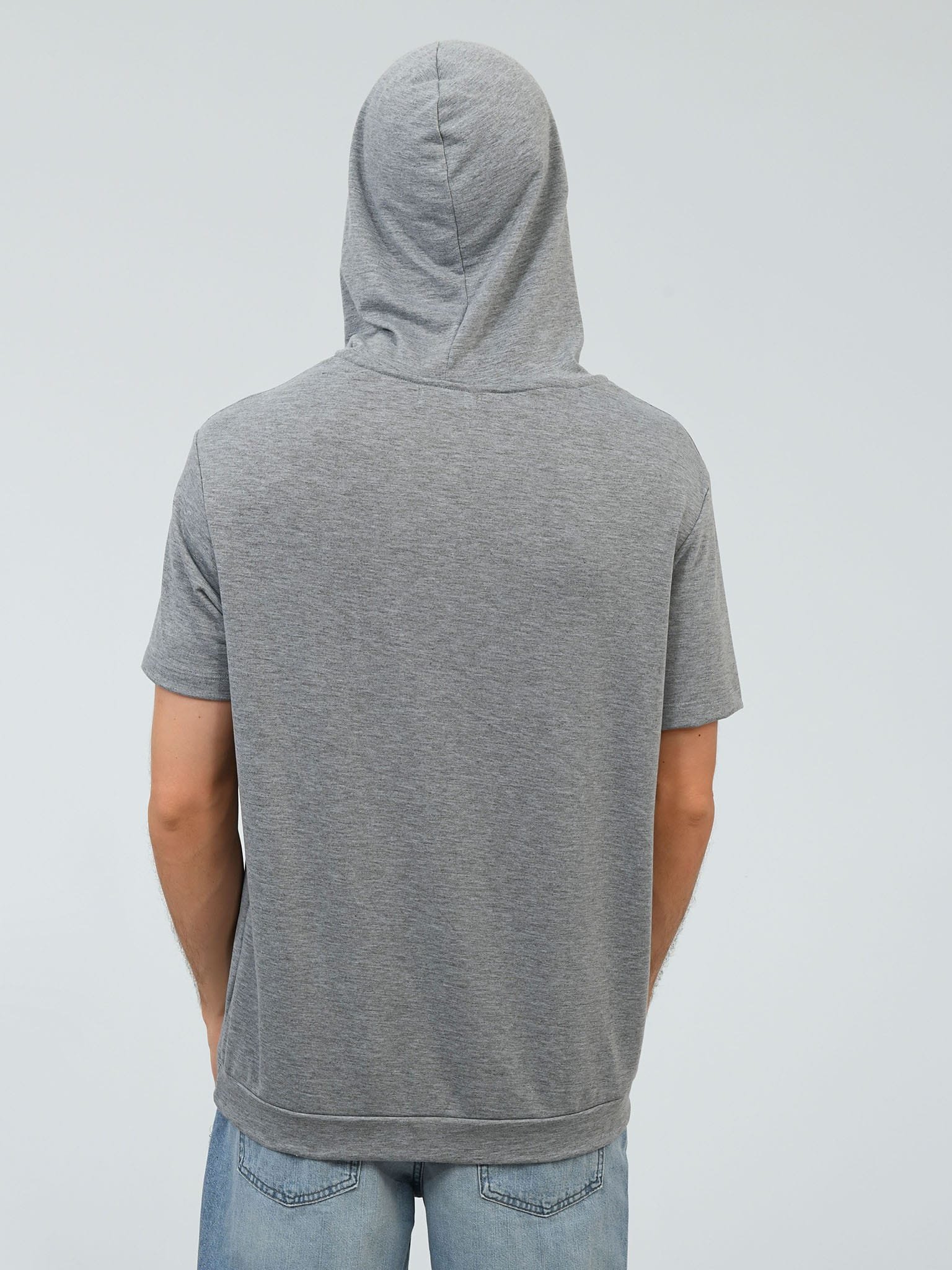 Playera gris manga corta con gorro y bolsillo canguro