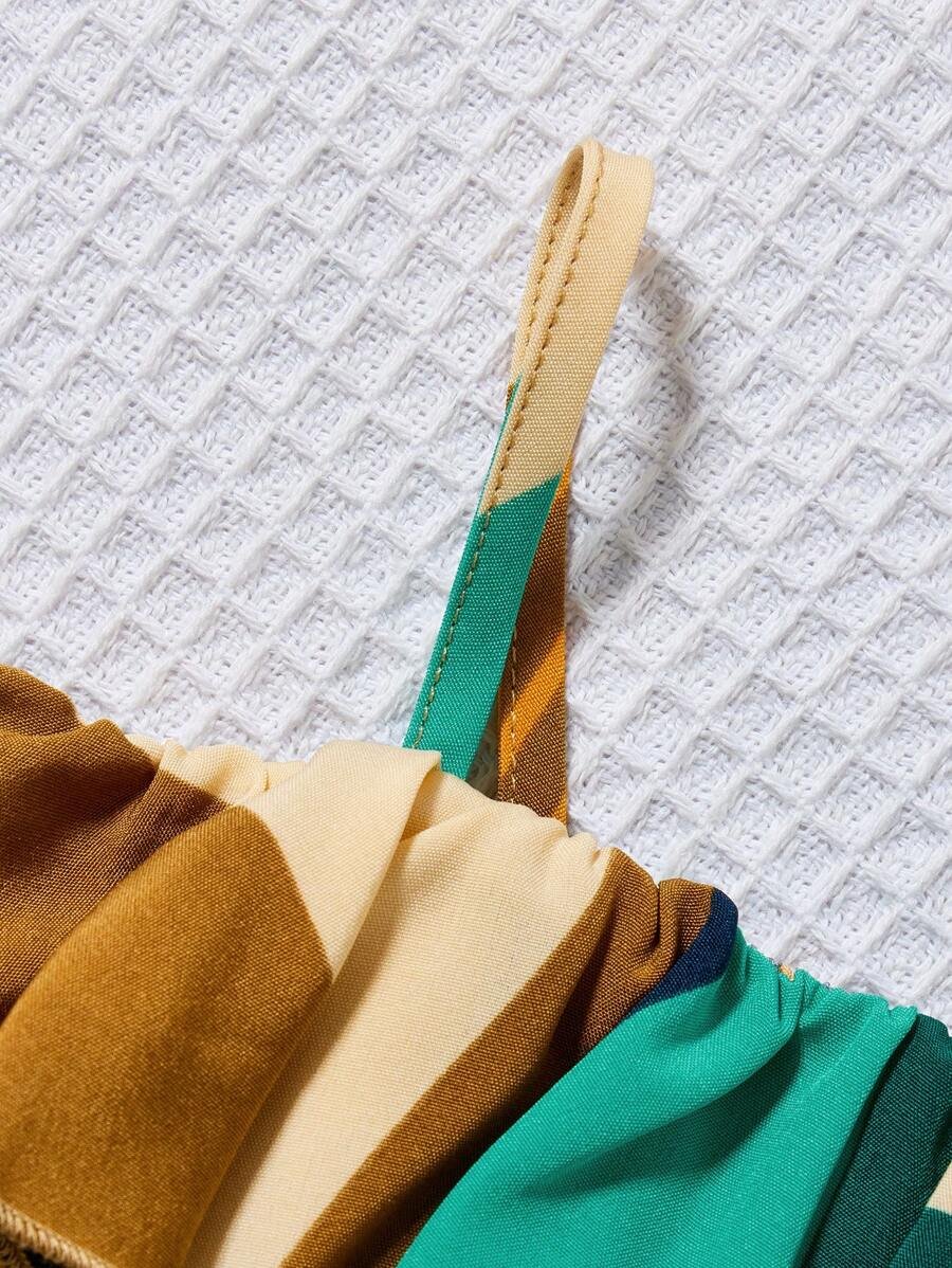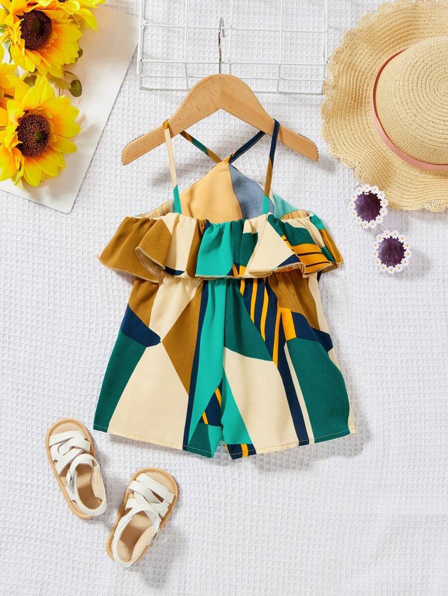 Ranita de niña con diseño floral, tirantes al cuello y cuello con volantes