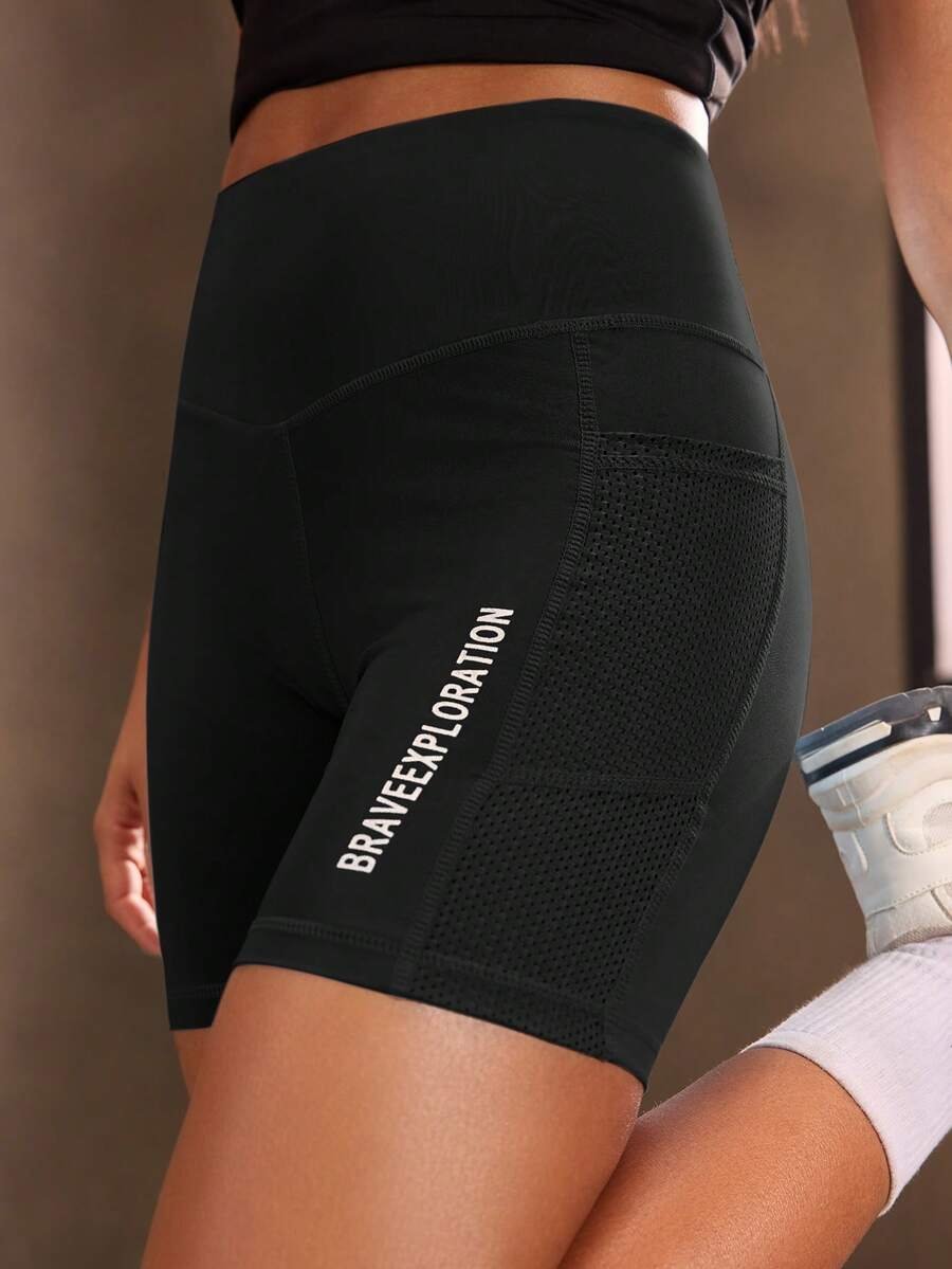 Shorts deportivos con gráfico de letras, cintura ancha y bolsillo
