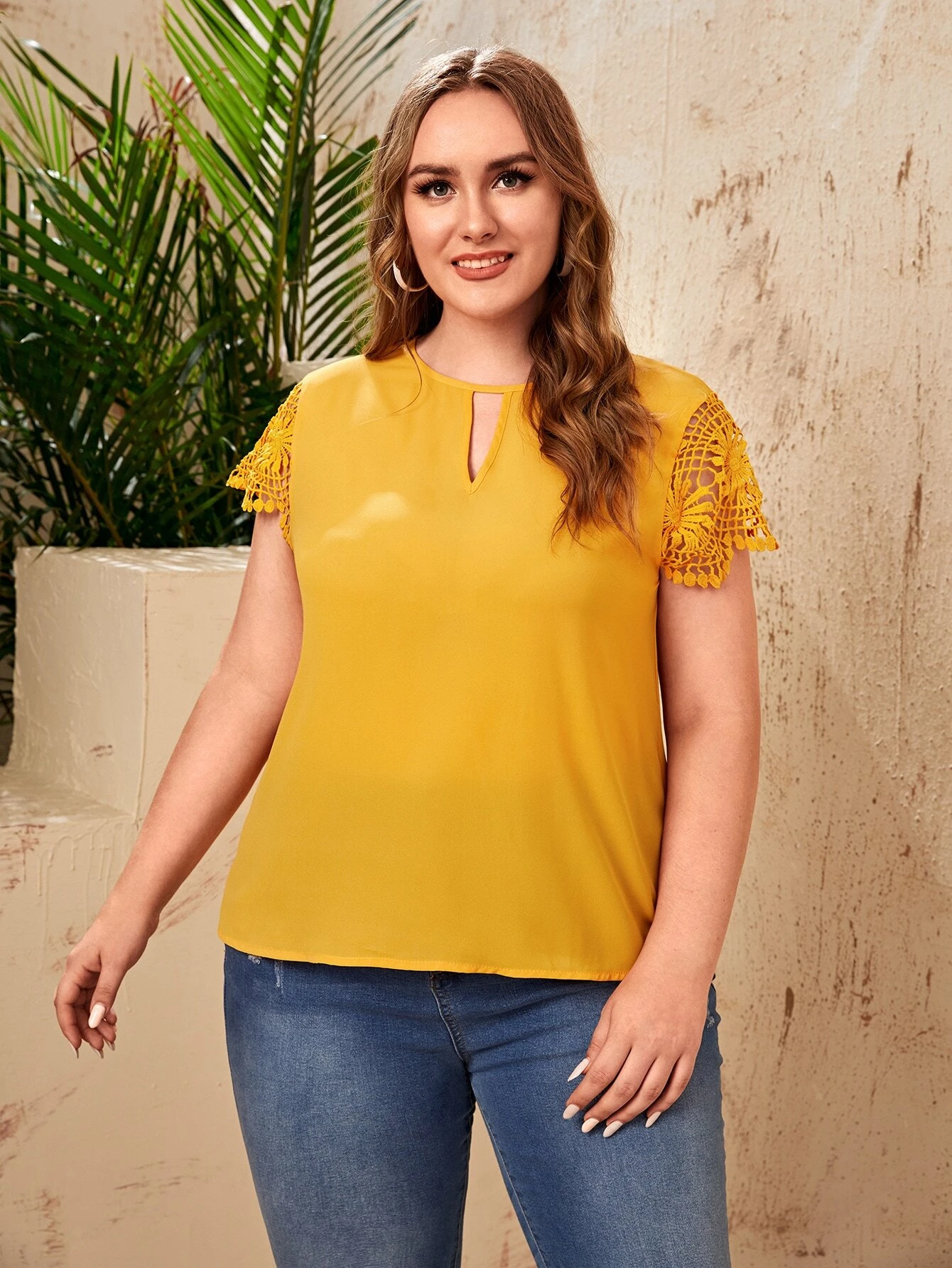 Top de cuello con abertura de ojo de manga con encaje