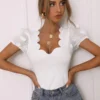 Top tejido de canalé de manga farol de lunares de borde en abanico