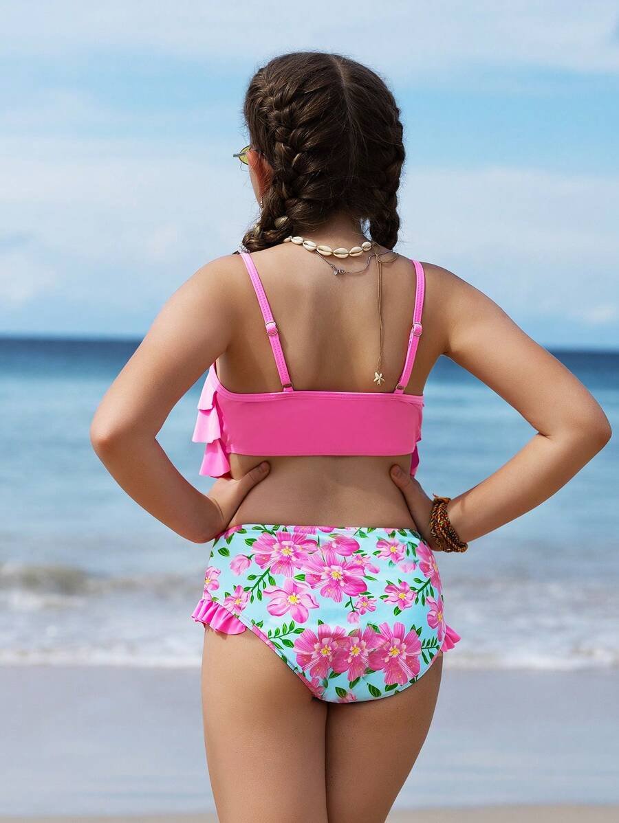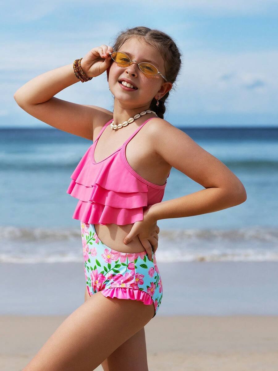 Traje De Baño De Una Pieza Lindo Para Niñas Con Bordes Ondulados