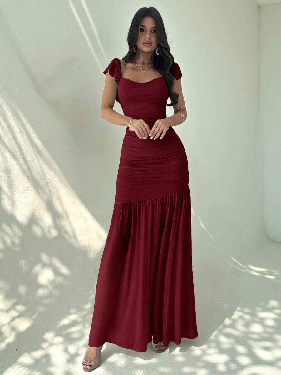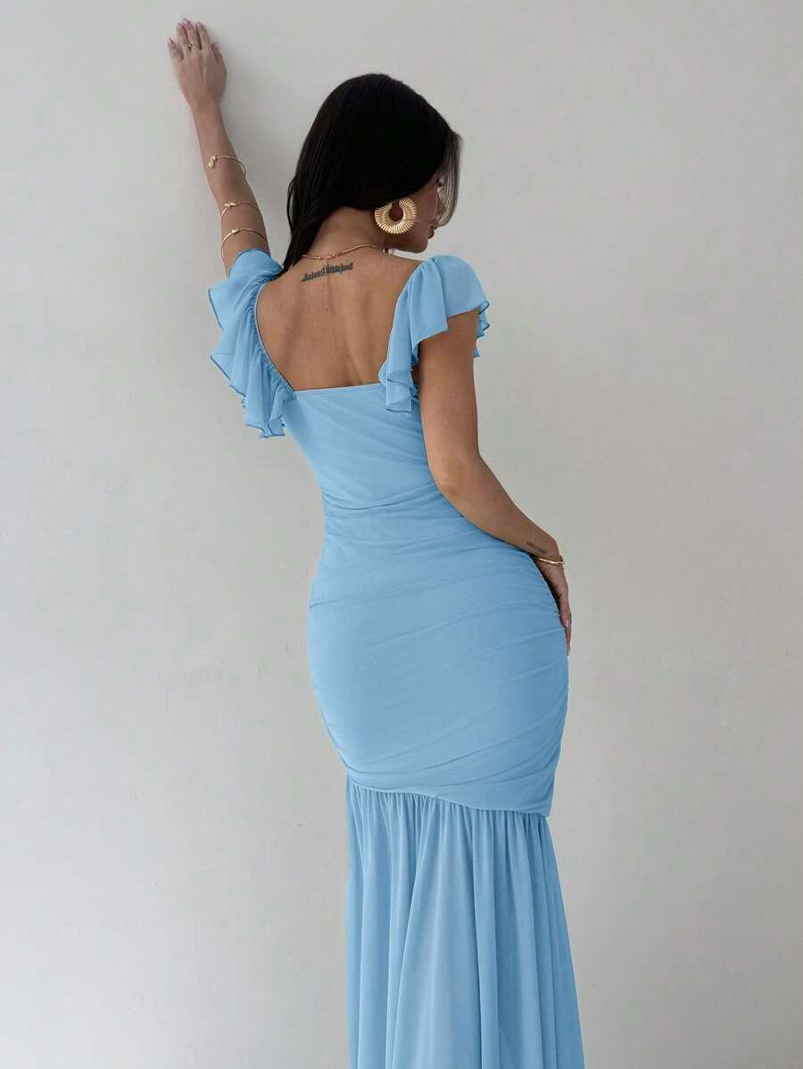 Vestido ajustado con volantes en el bajo, cintura anudada y malla