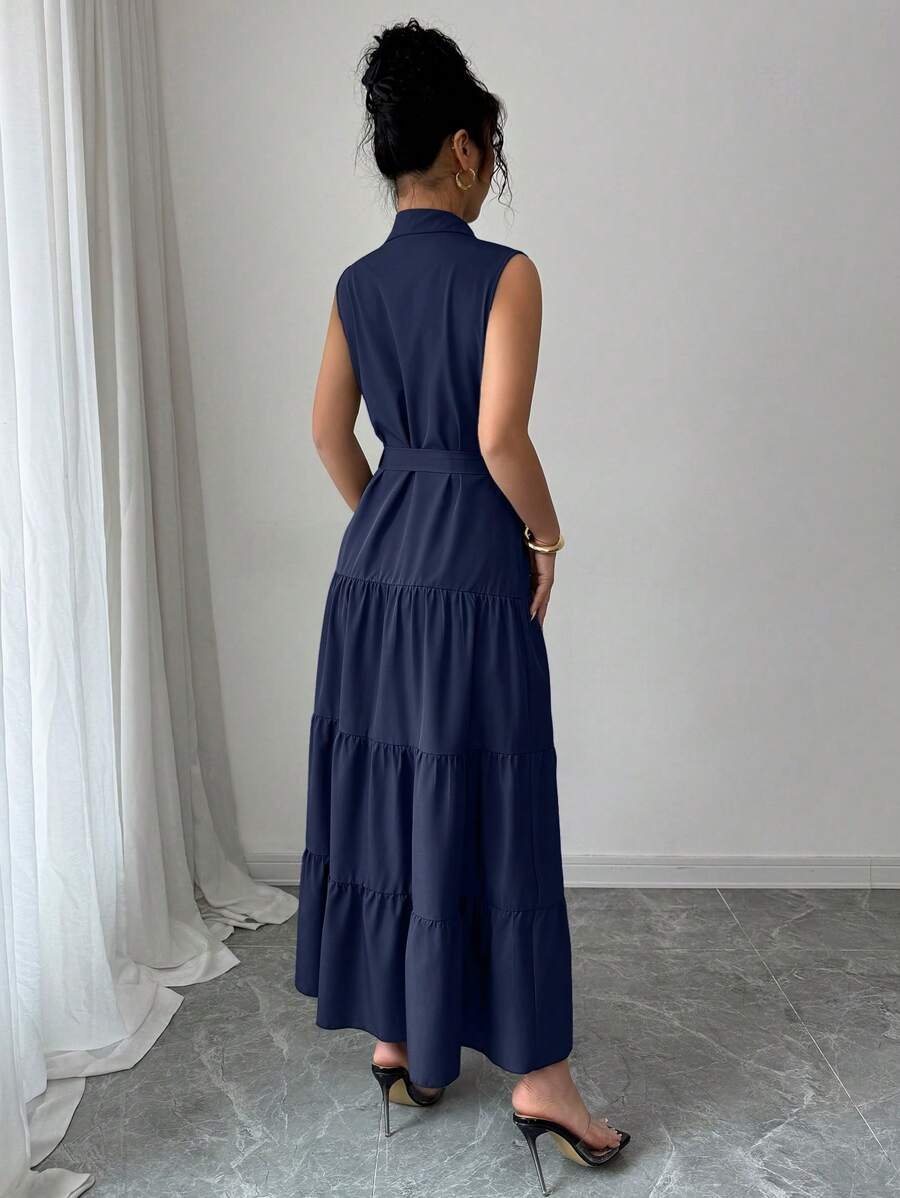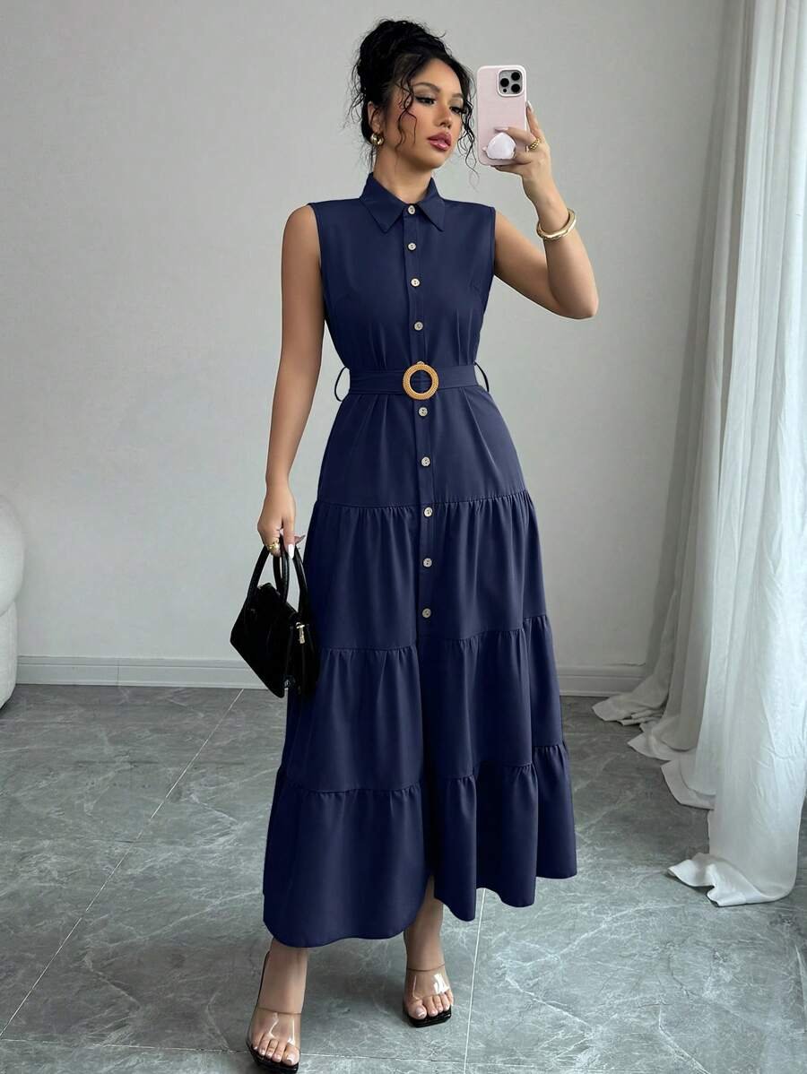 Vestido camisero informal sin mangas con volantes en el bajo