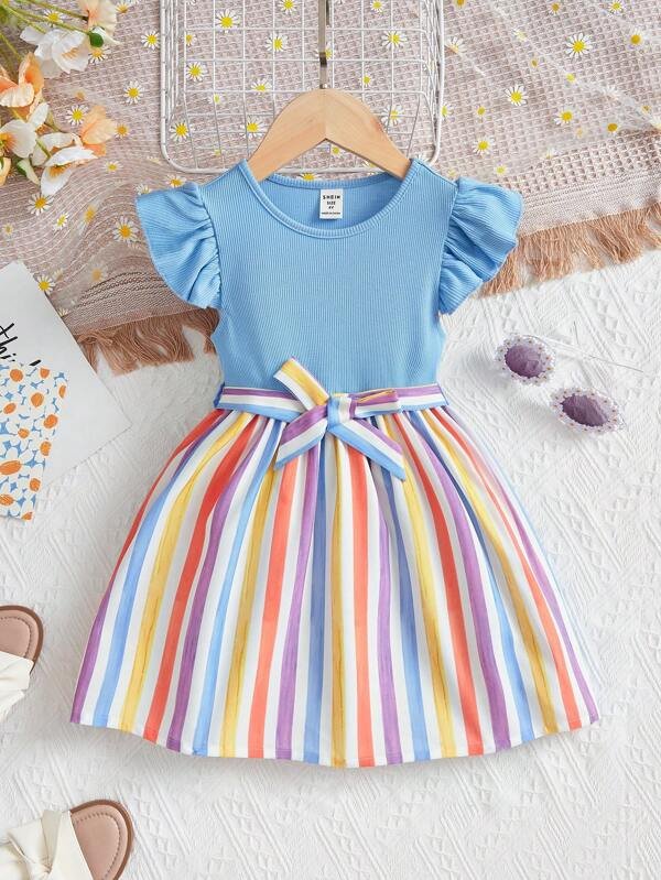 Vestido Casual De Niñas Pequeñas Con Mangas Voladoras Y Manga Corta