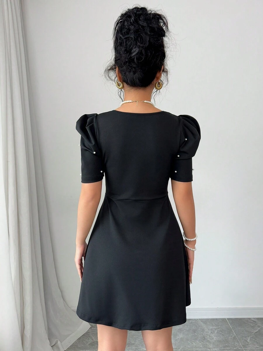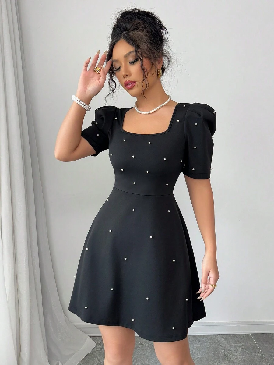 Vestido con cuello cuadrado, mangas gigot y decoración de perlas