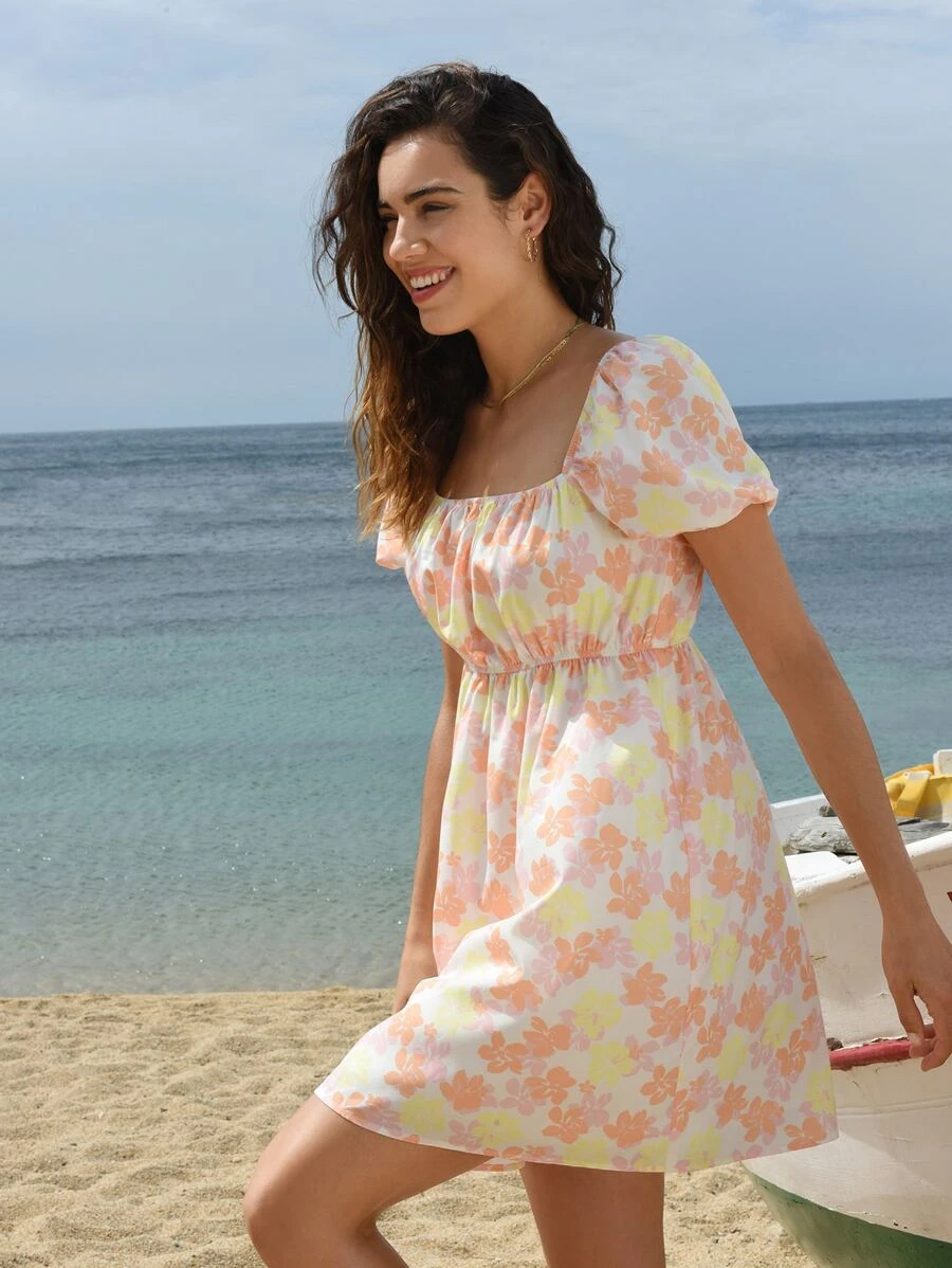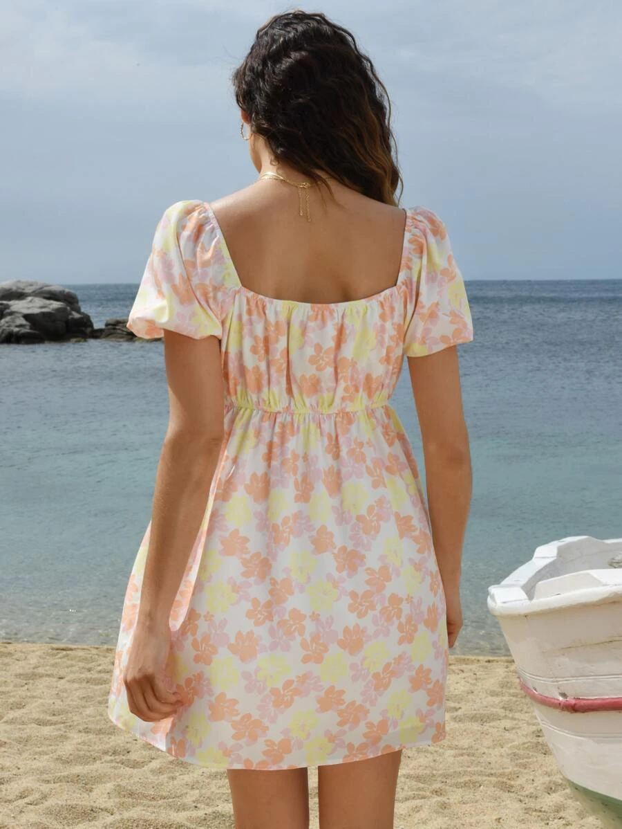 Vestido con estampado floral de cuello cuadrado de manga farol
