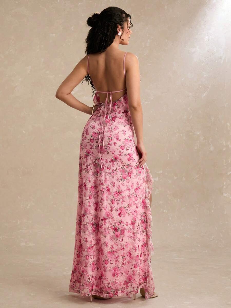 Vestido con estampado floral, volantes en el bajo y abertura lateral