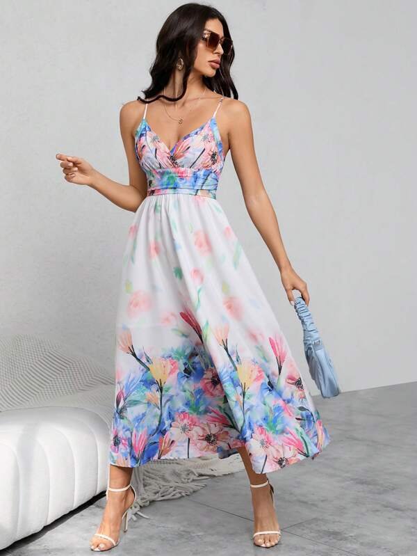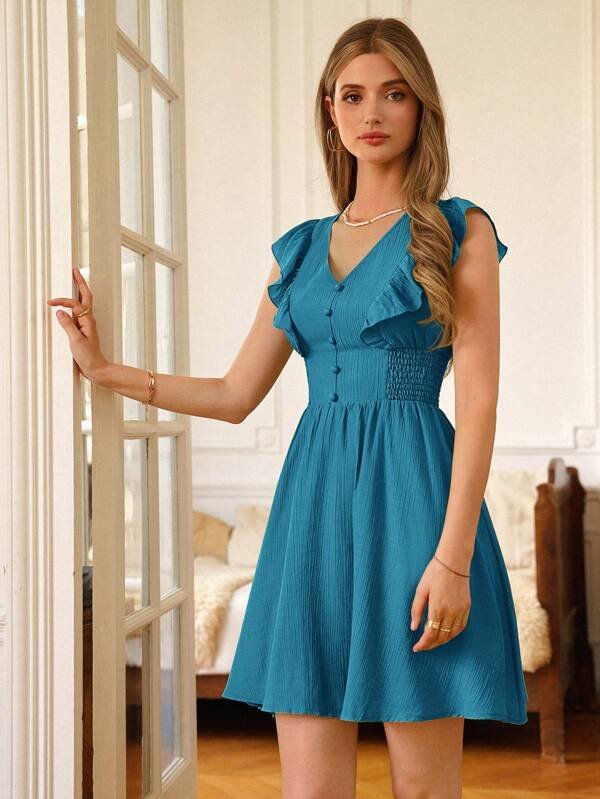Vestido Con Ribete De Volantes Y Cuello En V De Color Sólido