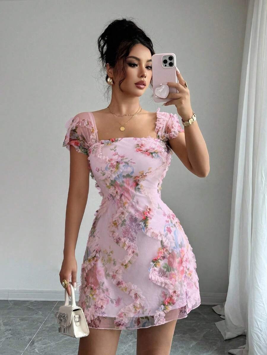 Vestido corto de gasa rojo sólido con hojas de loto en cascada