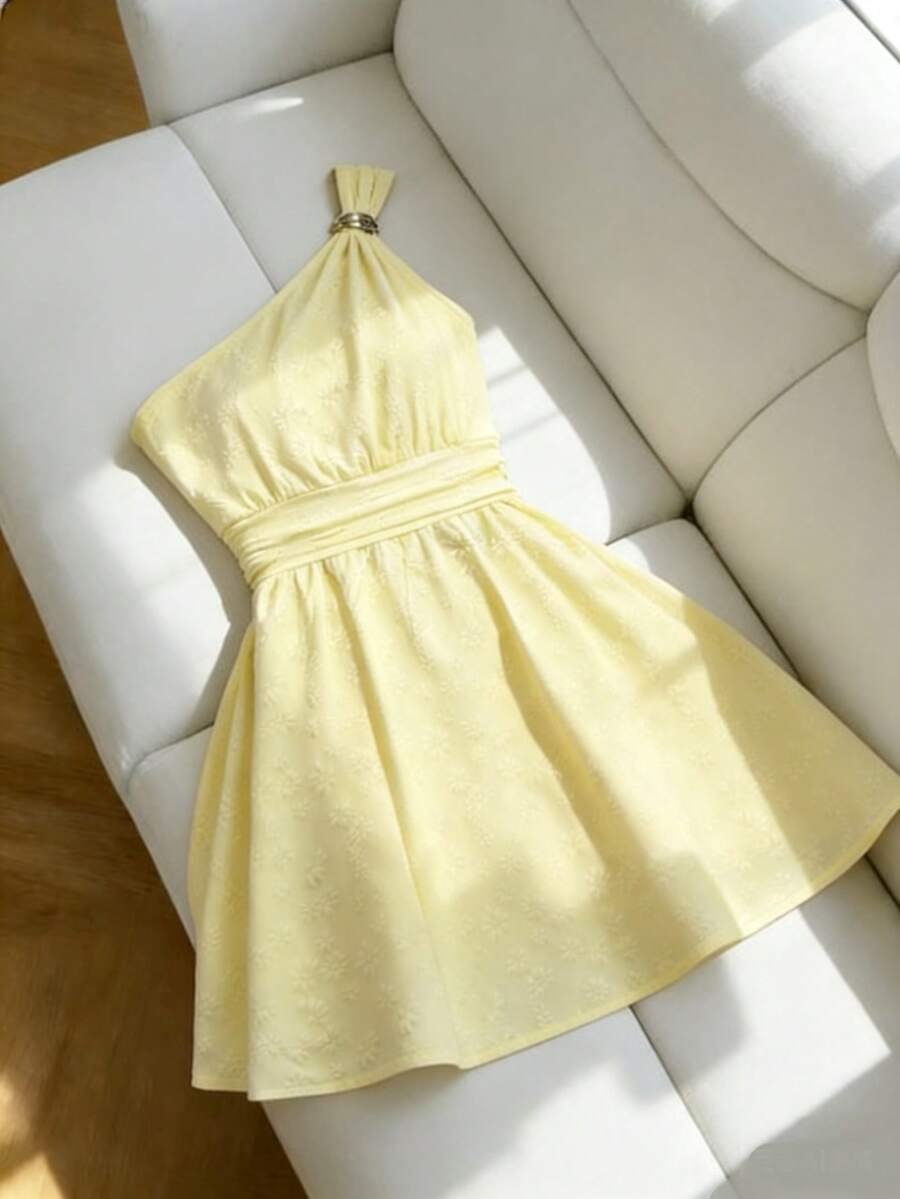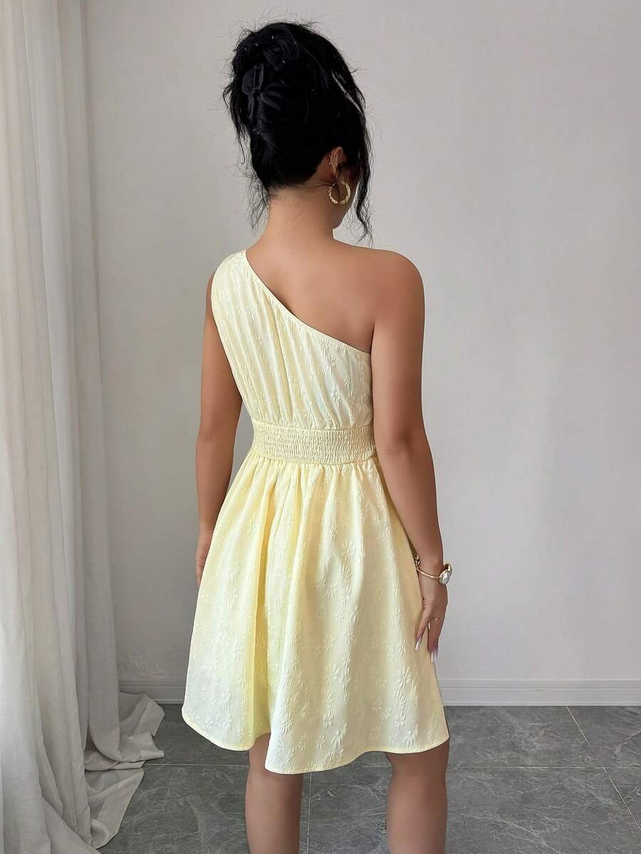 Vestido corto unicolor con detalle de cintura fruncida asimétrica