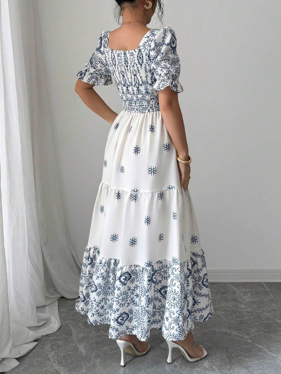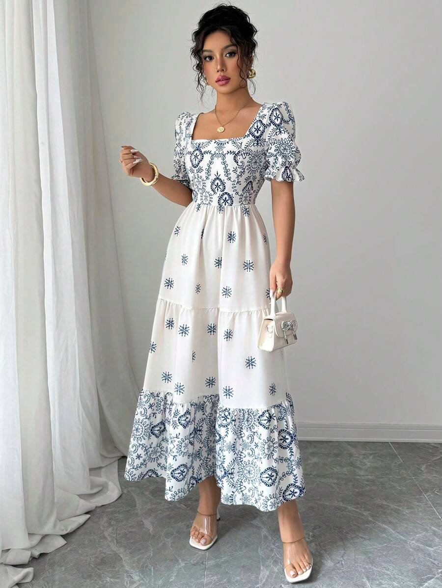Vestido de corta manga con cuello cuadrado y cintura entallada