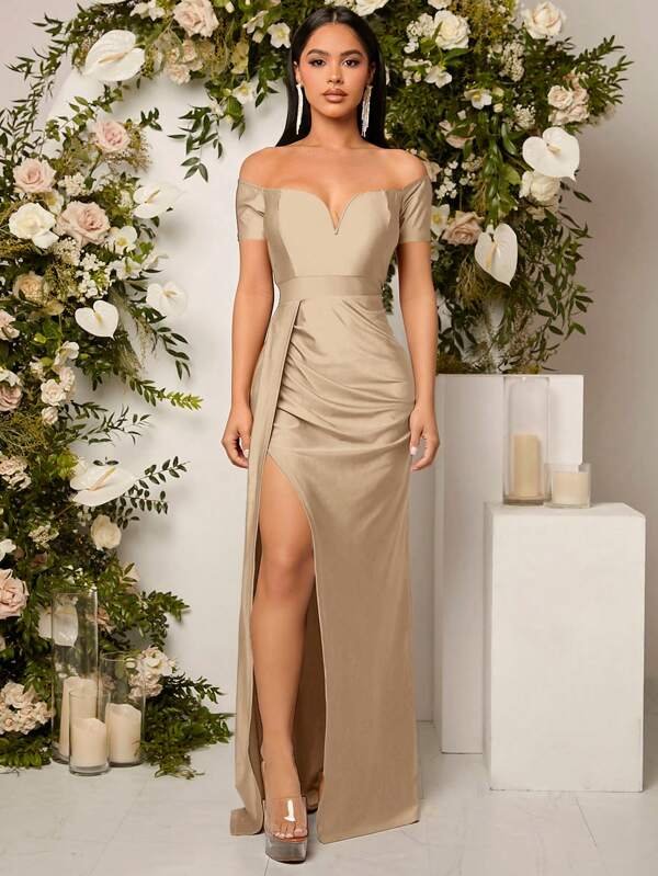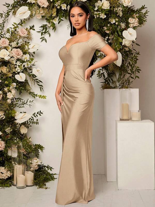 Vestido de dama de honor de hombros descubiertos fruncido de muslo con abertura con fruncido lateral