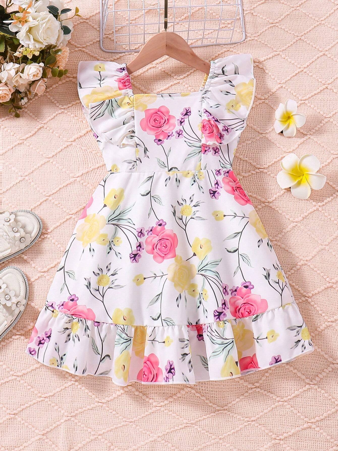 Vestido De Niña Con Diseño Floral, Cinturón Y Abertura Trasera