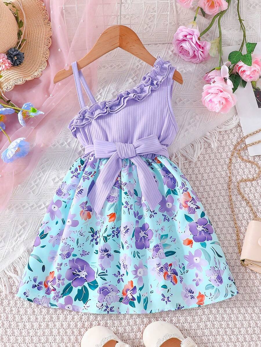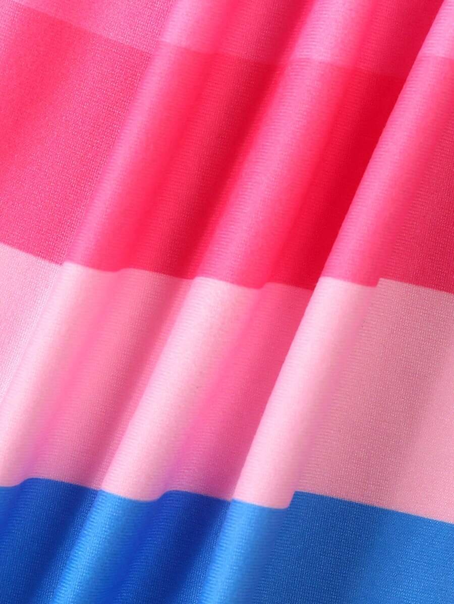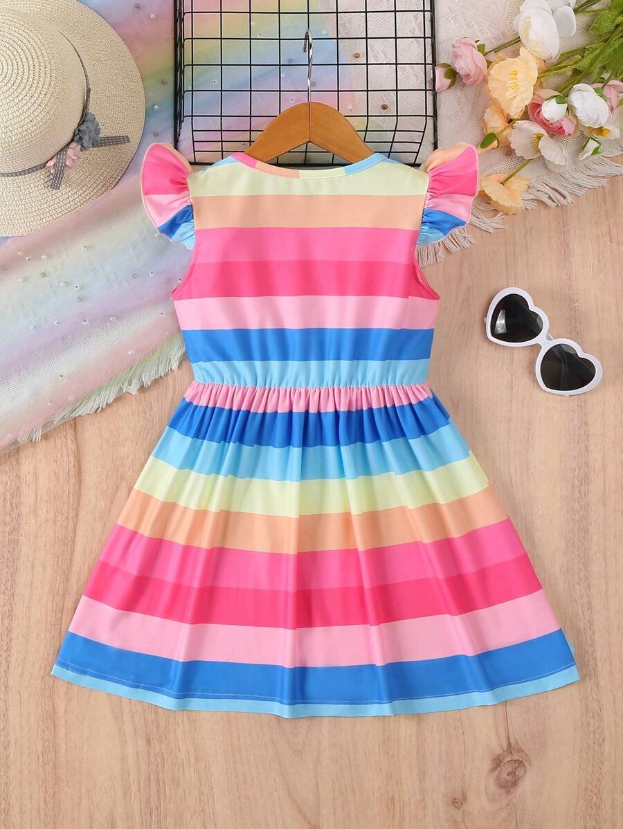 Vestido de niña joven con cuello redondo y diseño plisado a rayas de varios colores