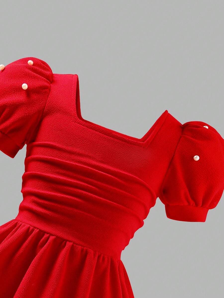 Vestido de punto con cuello cuadrado, mangas abultadas y cuentas