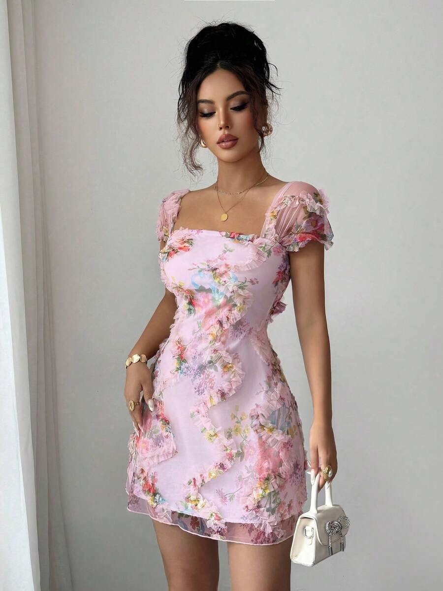 Vestido de tirantes ajustado con volantes de tul con estampado